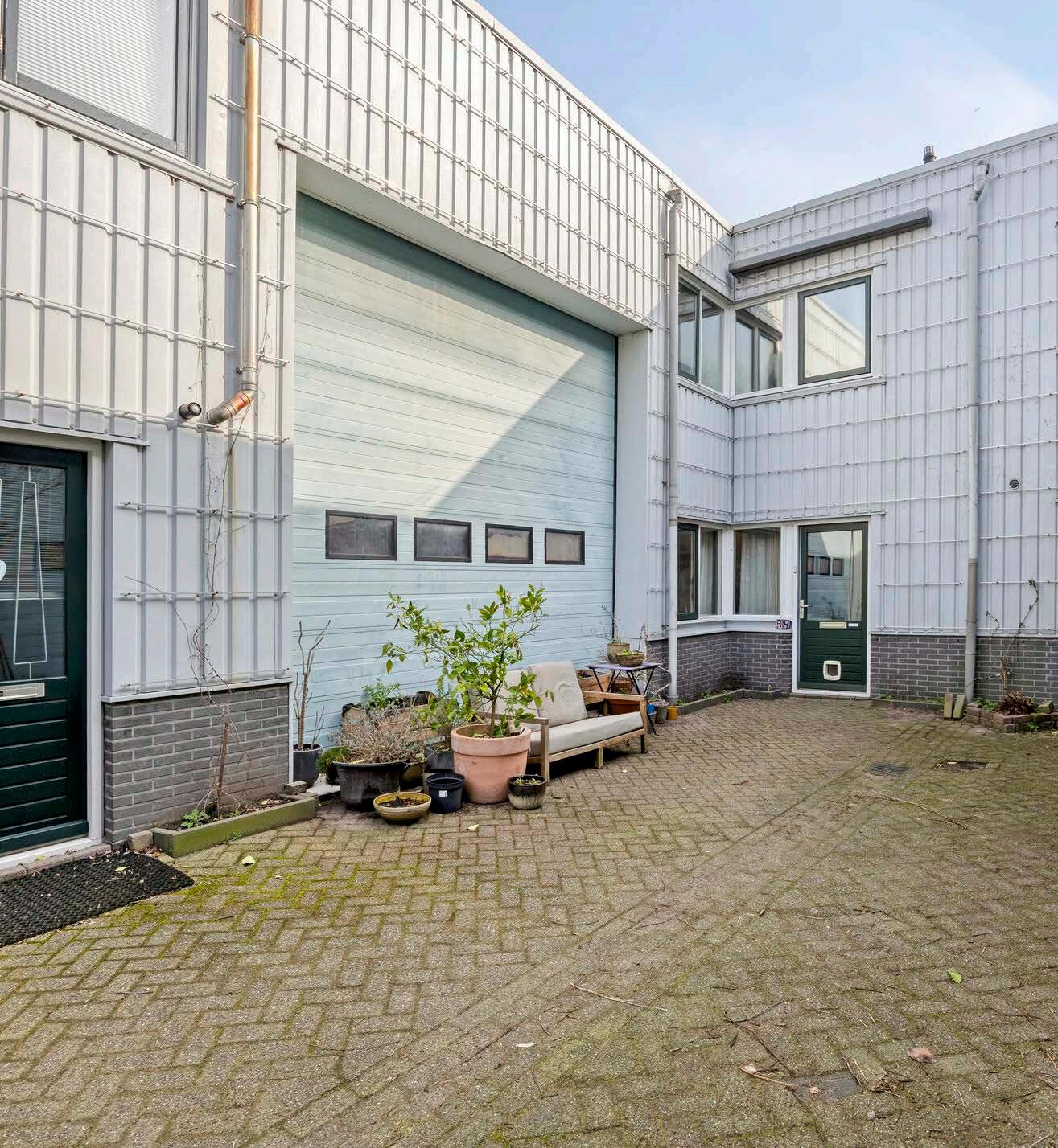 De voorzijde van het gebouw ligt op het zuiden, aan het einde van de binnenstraat.Bij geopende hangardeur kun je heerlijk zowel buiten als binnen in de zon zitten.