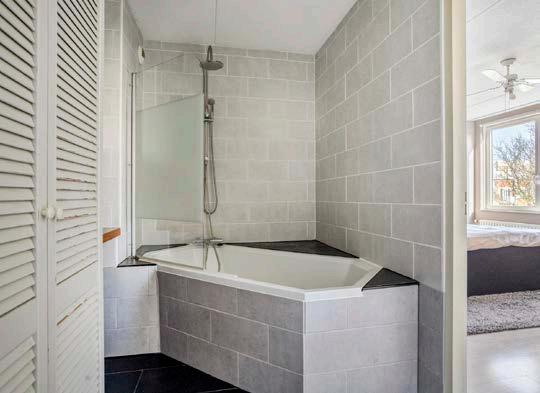 De badkamer is volledig betegeld en uitgerust met een ligbad dat tevens dienstdoet als douche, voorzien van een thermostaatkraan en een moderne wastafel. In de handige inbouwkast tref je tevens de wasmachine en droger aan. Dit zorgt ervoor dat de badkamer zowel functioneel als strak modern in gebruik is.