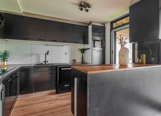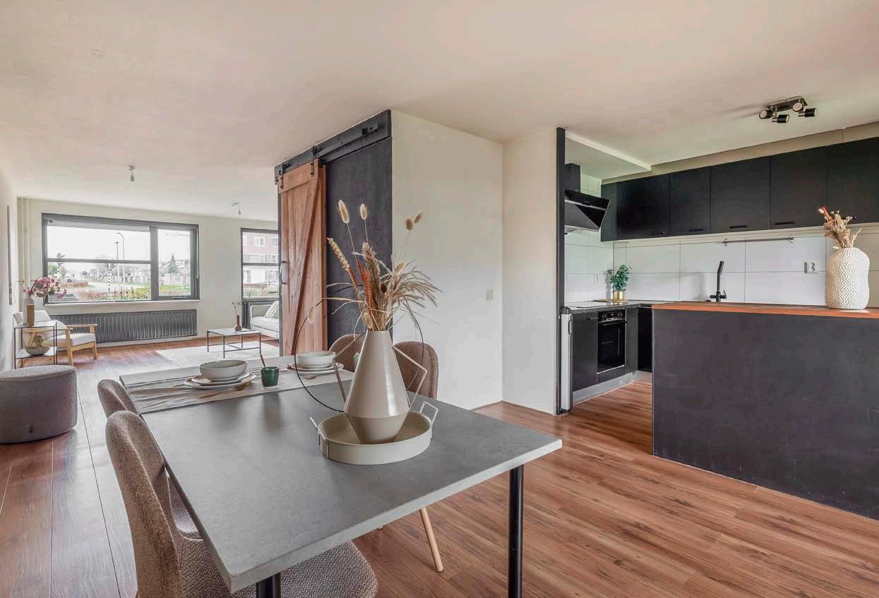 Aan de achterzijde bevindt zich ook de keuken, een praktische hoekopstelling met veel werkbladruimte en de nodige inbouwapparatuur.