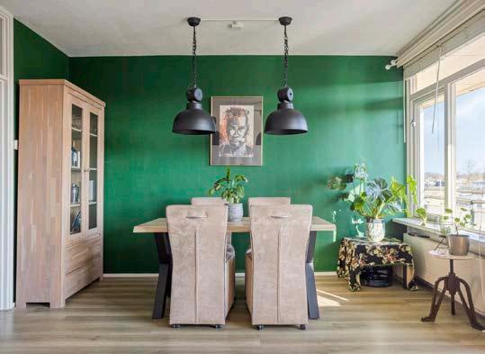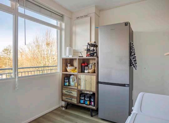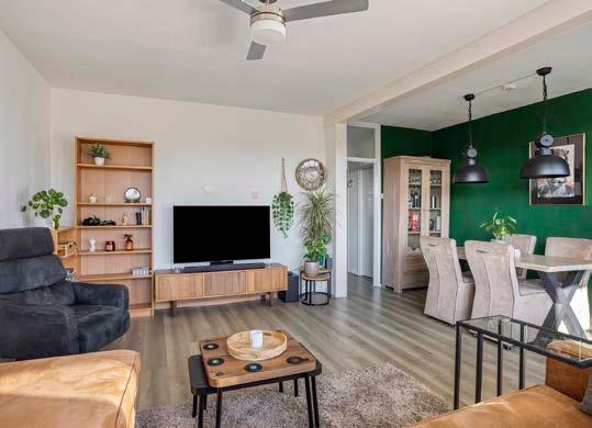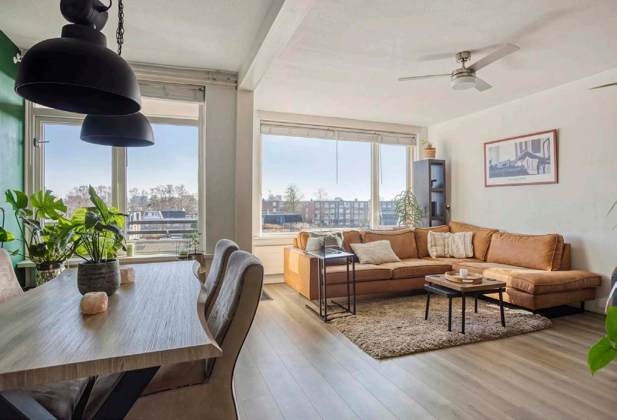 De woonkamer biedt een aangename leefruimte met voldoende plek voor een zit- en eethoek. Door de grote ramen komt er veel natuurlijk licht naar binnen, wat zorgt voor een prettige en open sfeer. De vloer is afgewerkt met laminaat, dat in meerdere ruimtes van de woning terugkomt.
