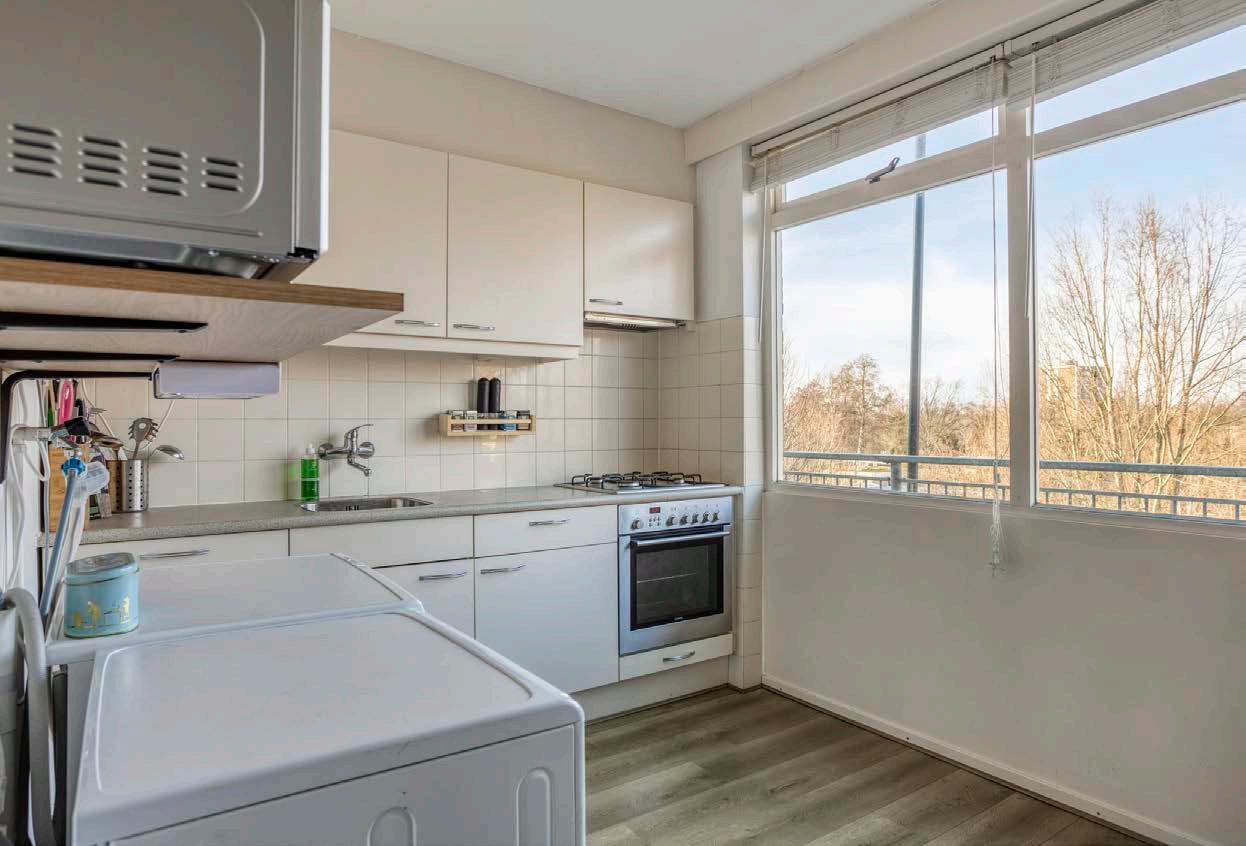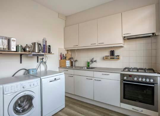 De keuken is functioneel ingericht en voorzien van een gasfornuis en een oven. Ook bevindt zich hier de aansluiting voor de wasmachine, waardoor alles praktisch bij elkaar zit.
