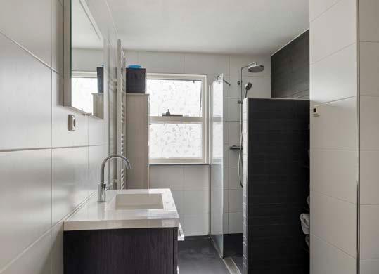 De badkamer beschikt over een inloopdouche, een wastafelmeubel met handige opbergruimte en een toilet.