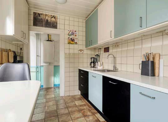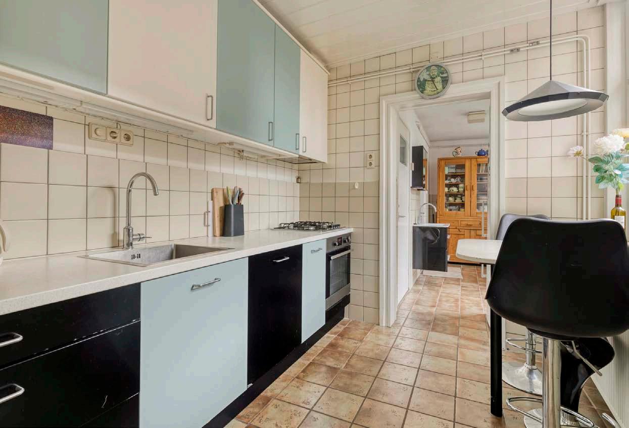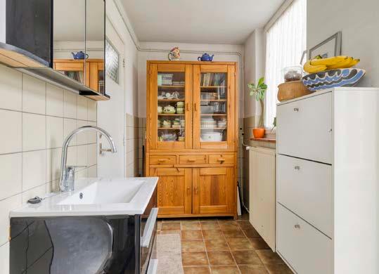 De keuken bevindt zich aan de achterzijde van de woning en straalt gewoonweg gezelligheid uit. Voorzien van de nodige inbouwapparatuur en met ruimte voor een fijne ontbijttafel, vormt dit al snel het hart van het huis. Aangrenzend ligt de bijkeuken, de badkamer met douche en een aparte wasruimte – alles wat je nodig hebt is hier binnen handbereik.