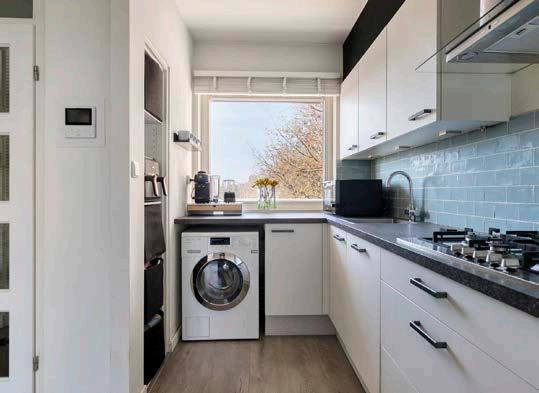 De open keuken is praktisch ingericht en voorzien van een groot raam. Stel je voor: een gezellige avond met vrienden of familie, terwijl je je favoriete gerecht bereidt en ondertussen geniet van het rustige uitzicht naar buiten.