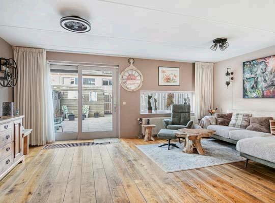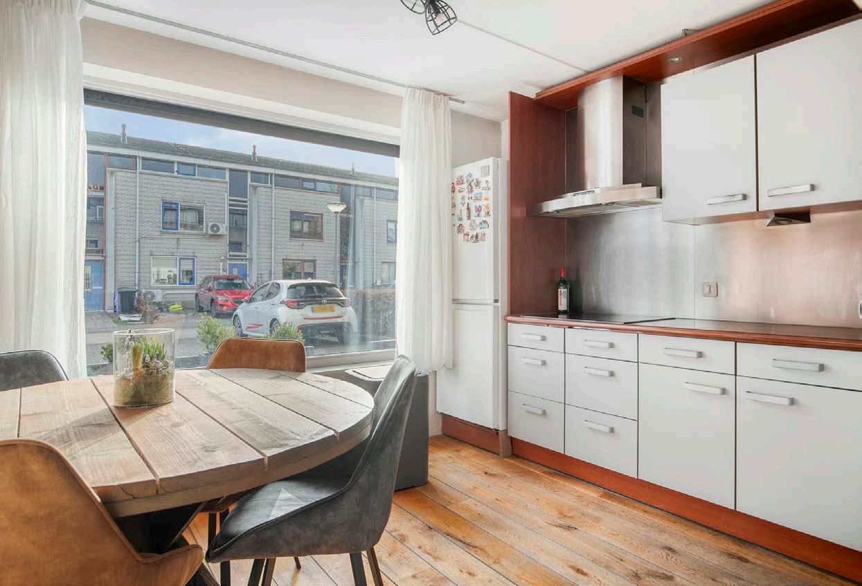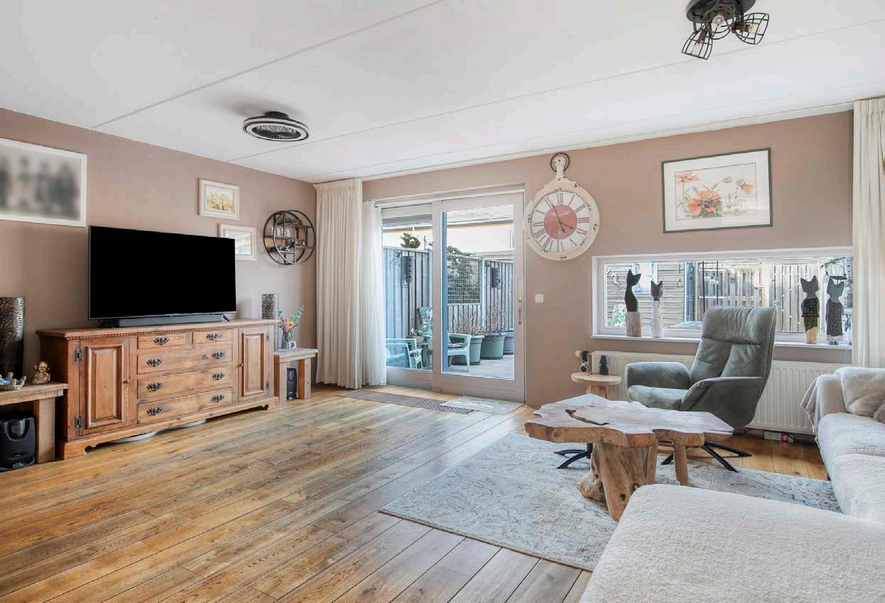 De hal biedt een praktische indeling met toegang tot het toilet, de meterkast en de trap naar boven. Eenmaal in de woonkamer ervaar je direct de royale breedte van bijna 6 meter, wat dit een uitnodigende en lichte ruimte maakt. Het gevoel van ruimte wordt nog versterkt door de grote schuifpui naar de achtertuin, waardoor je het buiten naar binnen haalt.