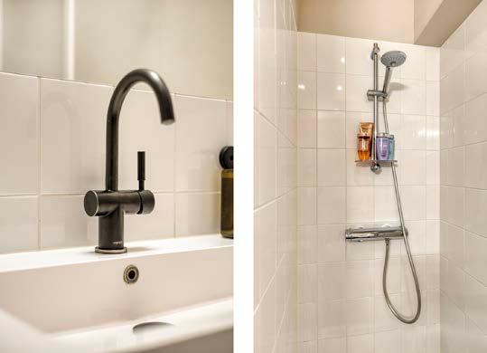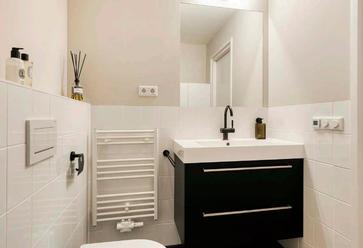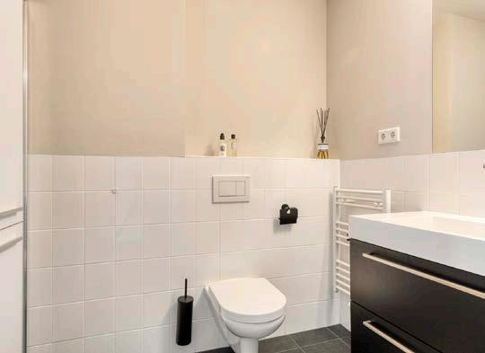 De moderne badkamer is betegeld en voorzien van een inloopdouche, een wastafel en een toilet.