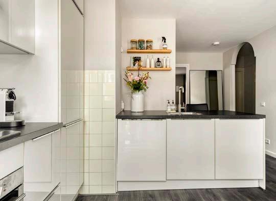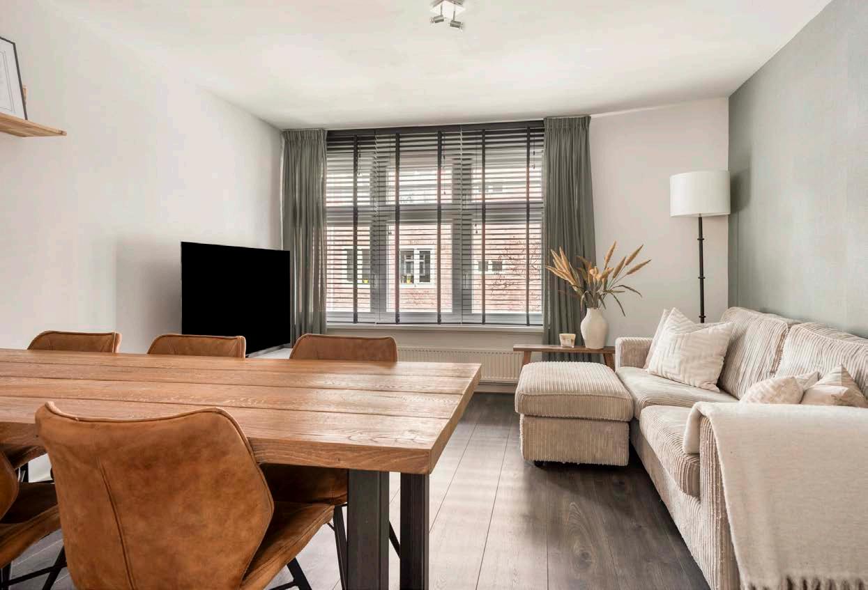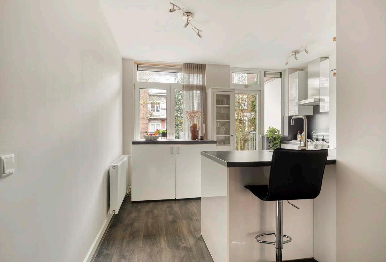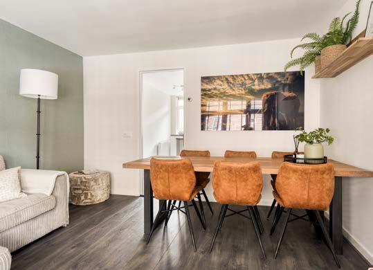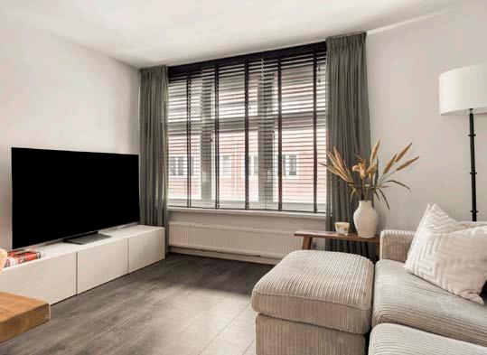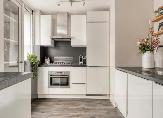 De lichte en ruime woonkamer en de halfopen keuken vormen samen het hart van het appartement. De ramen aan voor- en achterkant zorgen voor een prettige lichtinval.