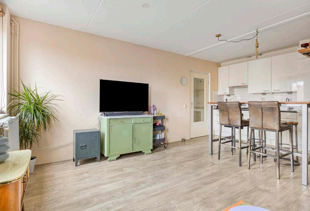 De woonkamer met open keuken voelt door de grote ramen direct uitnodigend en licht aan. De keuken is voorzien van de nodige inbouwapparatuur en vormt samen met de woonkamer een prettige leefruimte.