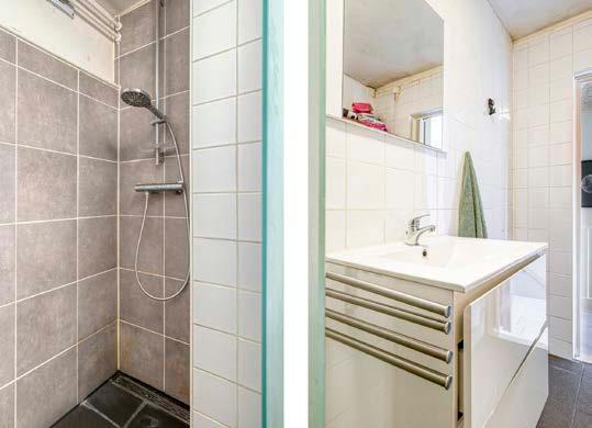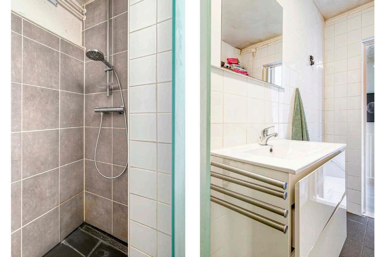 De moderne badkamer biedt alle comfort: een douche, wastafelmeubel en zelfs de witgoedaansluitingen – alles binnen handbereik.