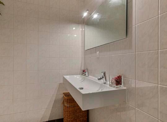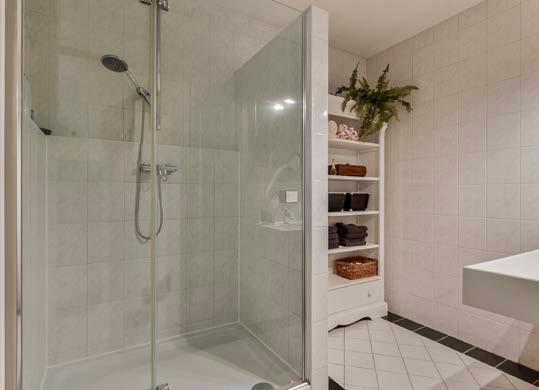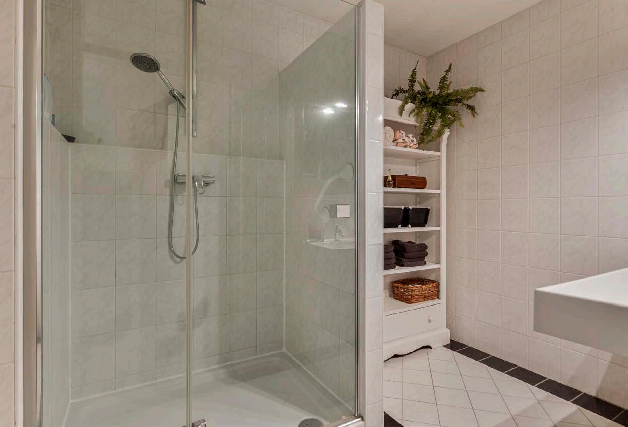 De badkamer ademt comfort uit dankzij de brede wastafel met dubbele kranen en een ruime inloopdouche. Een separaat toilet in de hal voegt extra gebruiksgemak toe.