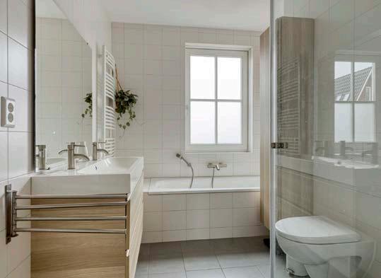 De badkamer heeft een nette, frisse uitstraling en hier ben je voorzien van tweede toilet, dubbel wastafelmeubel, douche en een ligbad.