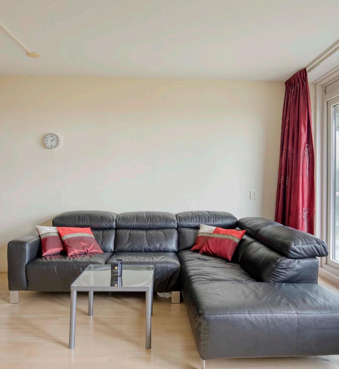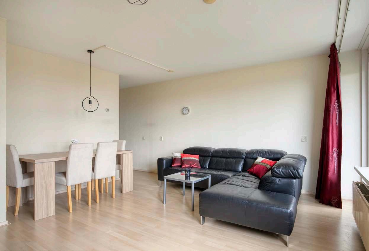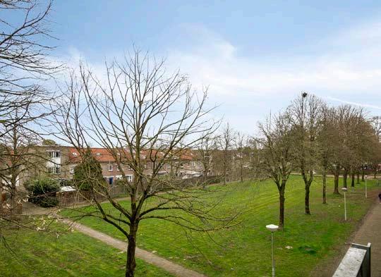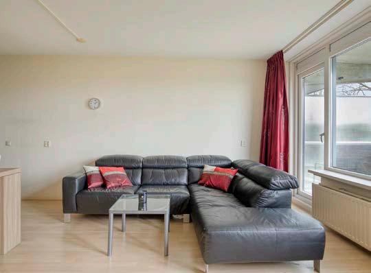 Vanuit de woonkamer heb je toegang tot het balkon en geniet je van een prettig en vrij uitzicht op het groen.