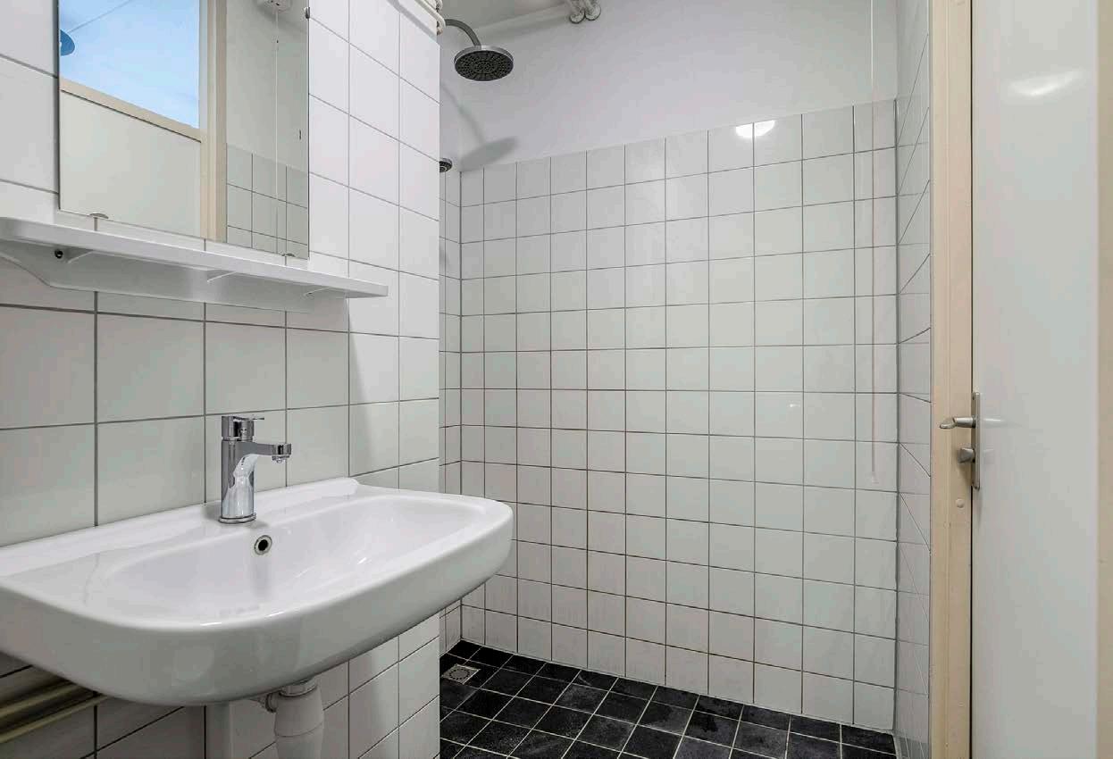 De verzorgde badkamer, compleet met een inloopdouche, wastafel, toilet en netjes betegeld in een tijdloze look. Hier begin en eindig je de dag ontspannen en fris.