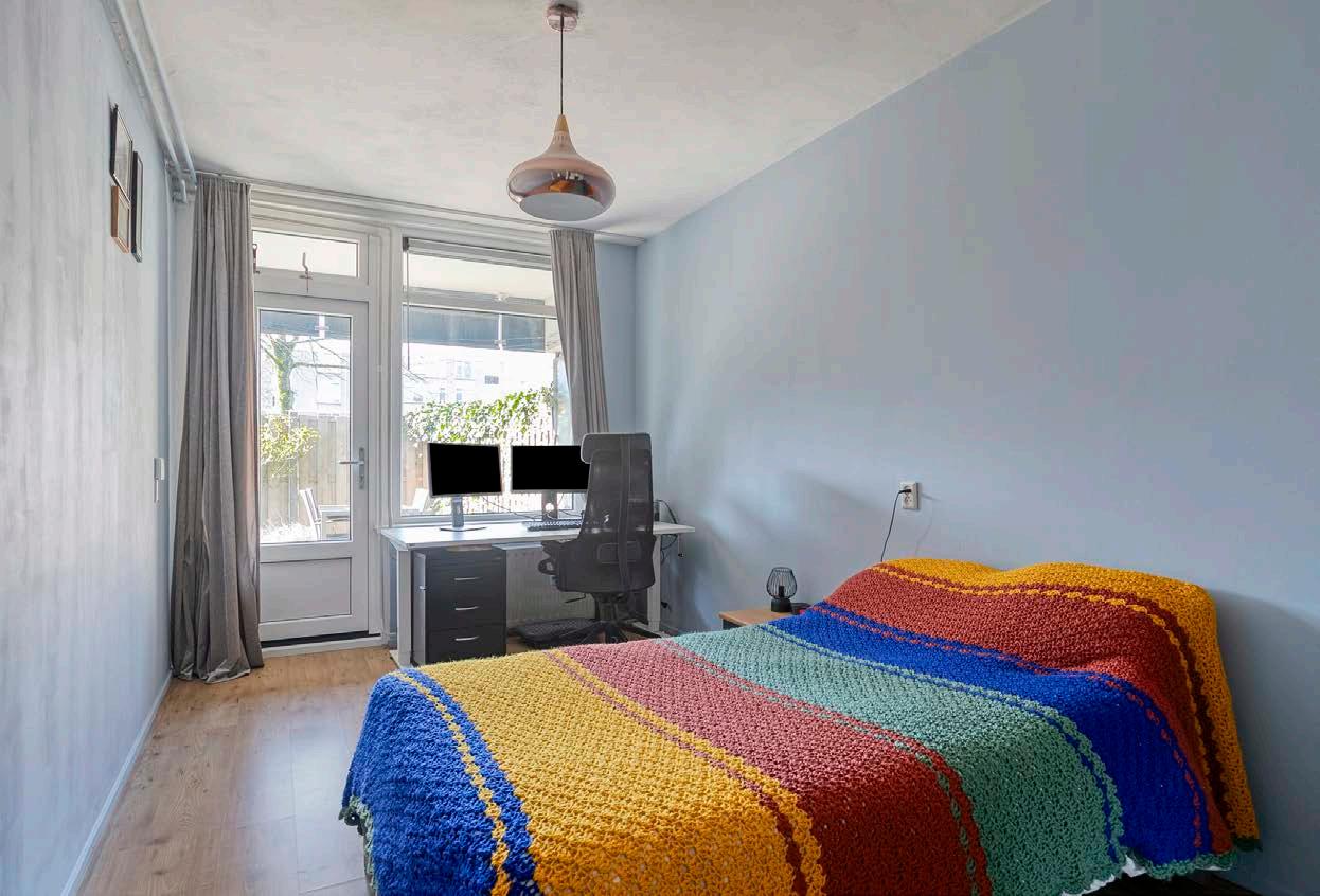 In de slaapkamer is zat ruimte om ook een bureau te plaatsen, zodat ik tijdens mijn werk nog naar buiten kan kijken. Waarbij ik regelmatig een ekster in mijn tuin heb gezien. Zomers was het helemaal genieten in mijn tuin en heerlijk in de zon een boek te kunnen lezen.