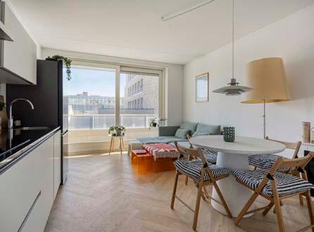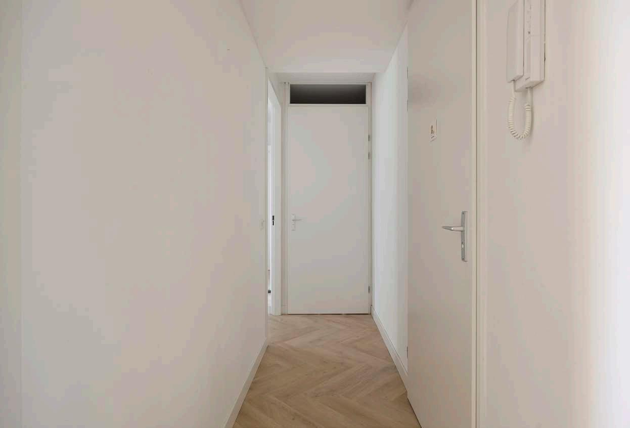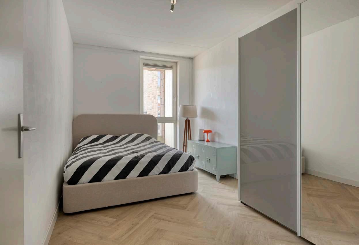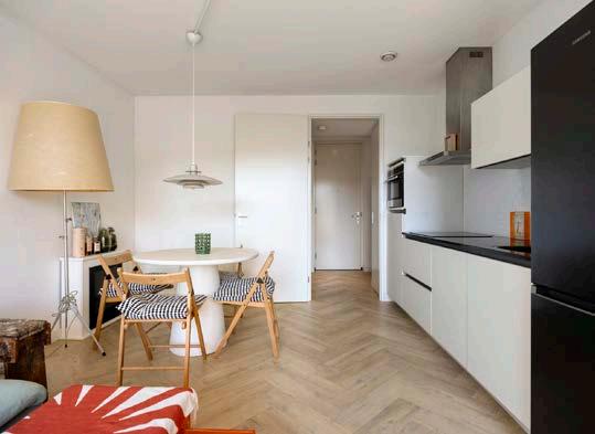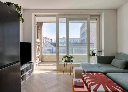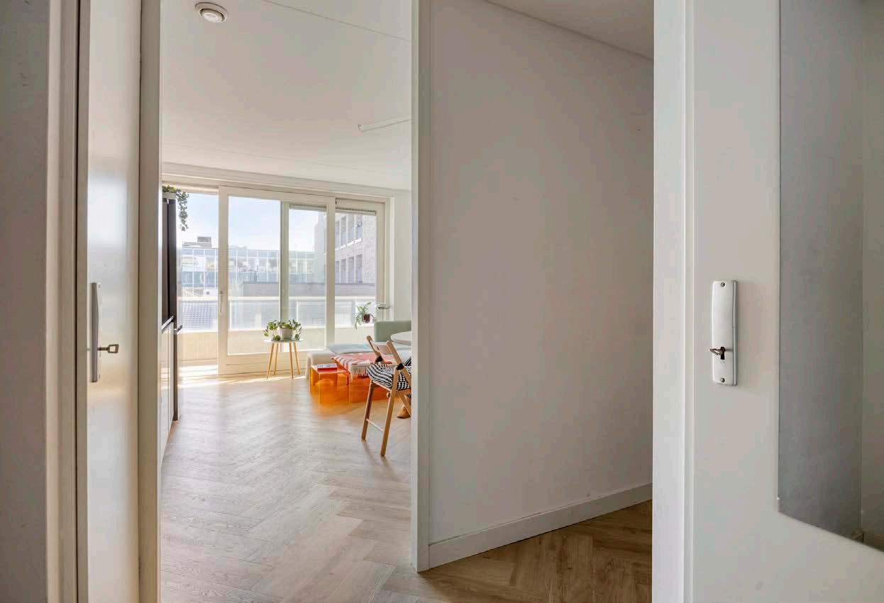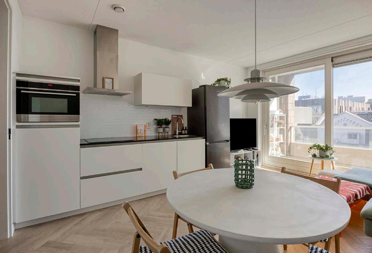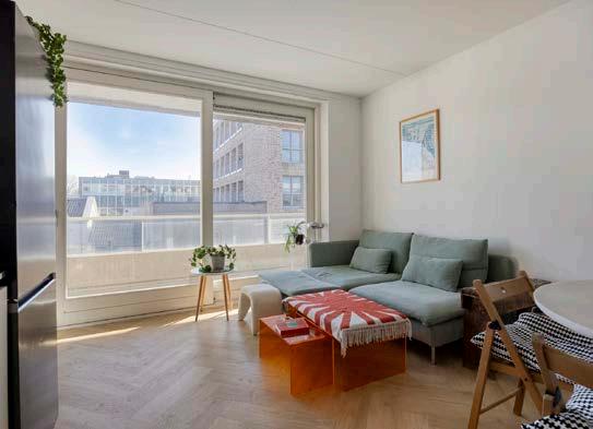 De woonkamer is licht, ruim en praktisch ingedeeld. Grote raampartijen zorgen voor een frisse en open sfeer. Een comfortabele plek om te ontspannen en te genieten van het stadsleven.