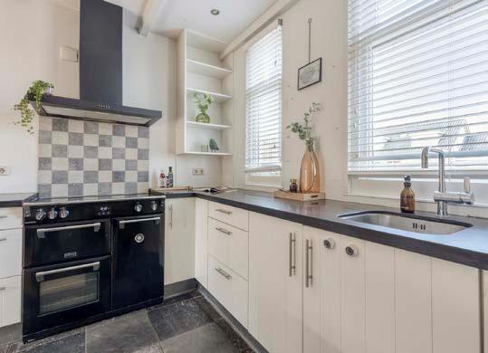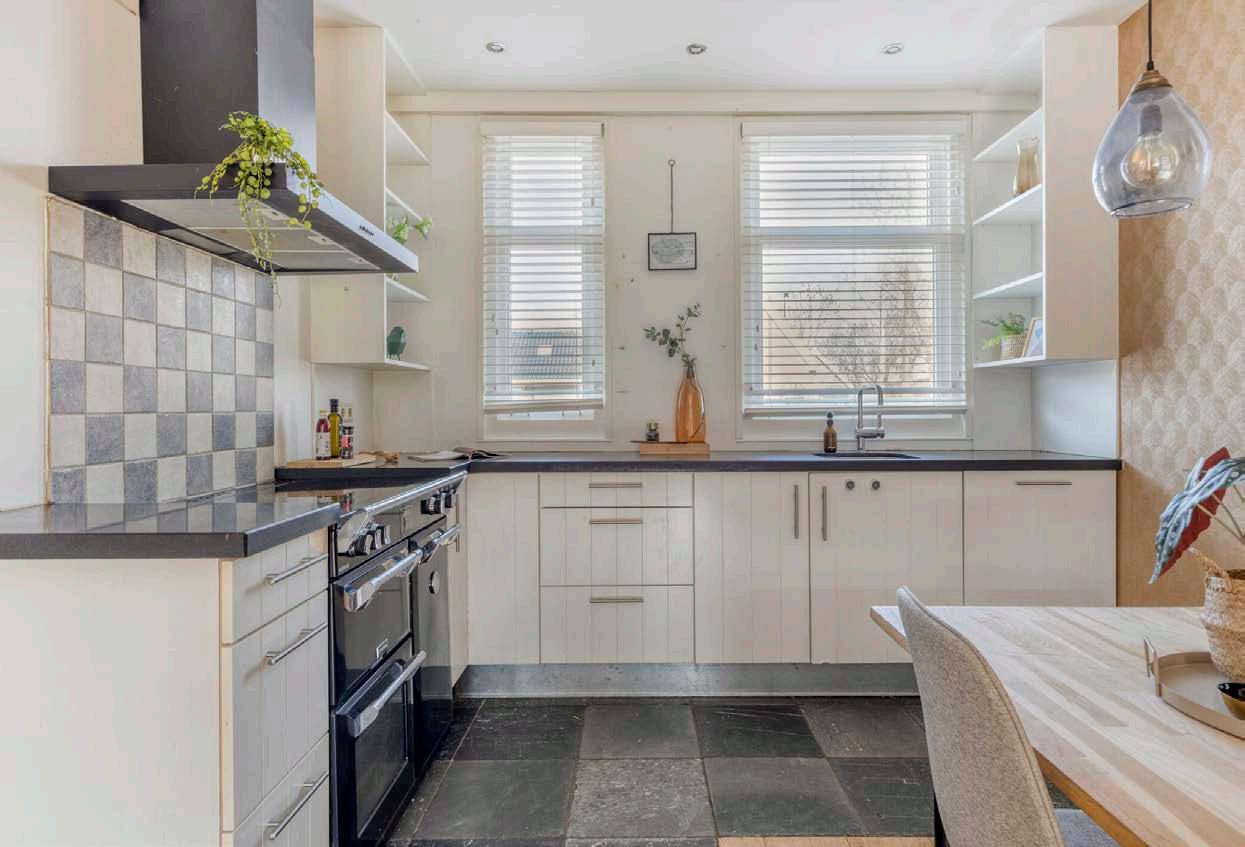 De keuken, gelegen aan de straatzijde. Kookliefhebbers opgelet: met een 6-pits fornuis, dubbele oven en een stenen aanrechtblad, is koken hier een waar genot. Bovendien zijn een vaatwasser en afzuigkap inbegrepen. Terwijl je de pannen op het vuur hebt staan, kijk je naar buiten en geniet je van de rustige straat.