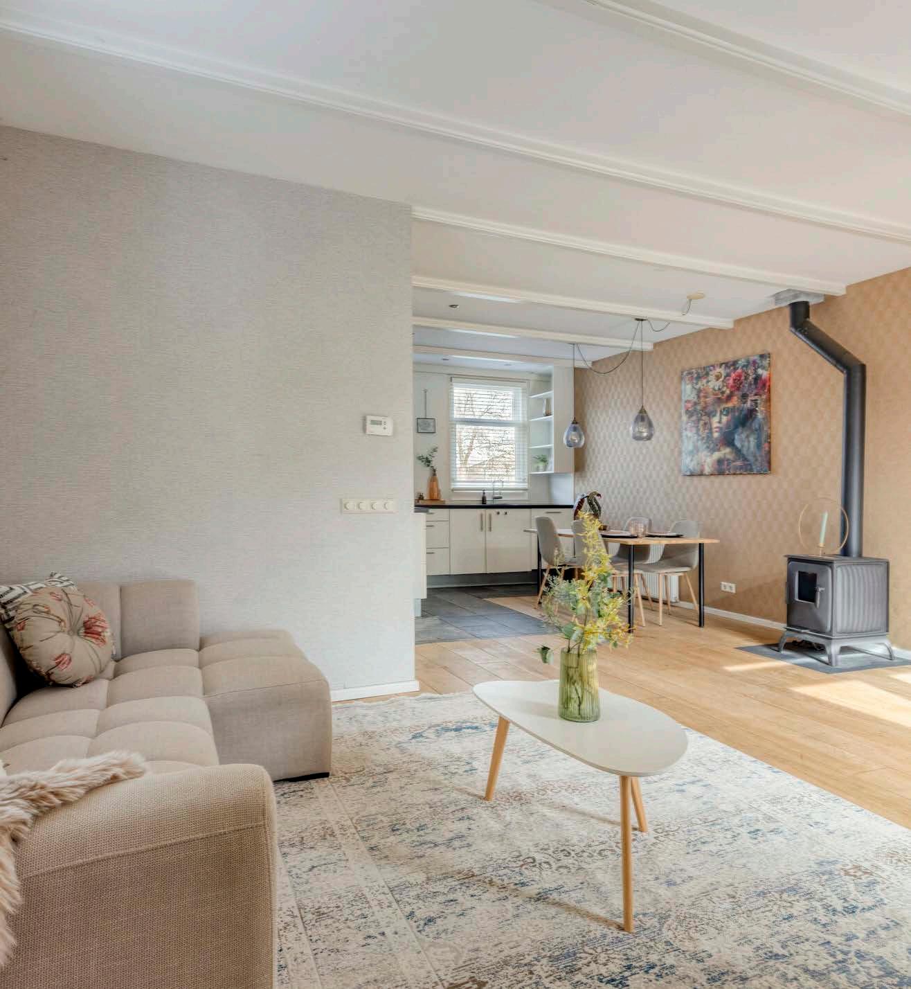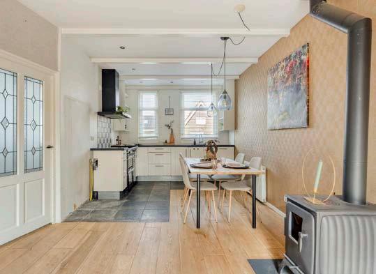De woonkamer is de plek waar je écht samenkomt. Het knisperende vuur van de houtkachel brengt direct warmte en gezelligheid. Door de openslaande tuindeuren sta je zomaar in de prachtige achtertuin.