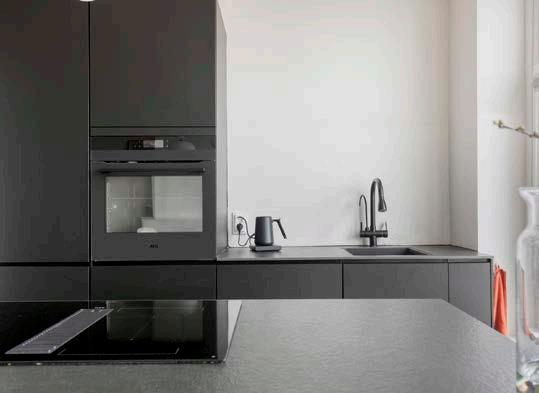 Een moderne keuken, welke is uitgerust met AEG apparatuur, die in 2022 is vernieuwd, waardoor er veel werk- en bergruimte is en je gemakkelijk contact houdt met de rest van de ruimte.