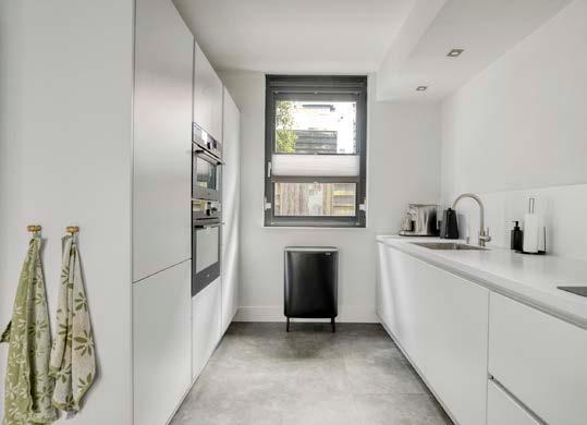 De moderne keuken is een absolute blikvanger –voorzien van alle benodigde inbouwapparatuur en met ruimte voor een gezellige eethoek.