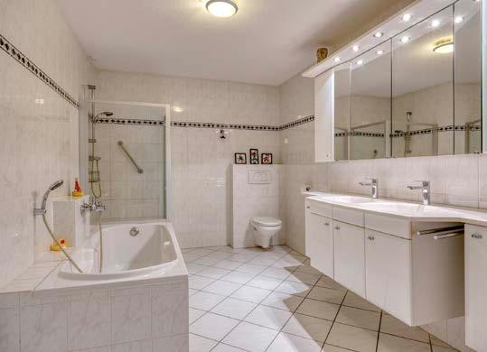 De complete badkamer biedt een ligbad, inloopdouche, dubbele wastafel en toilet. Ideaal voor een ontspannen start of afsluiting van de dag.