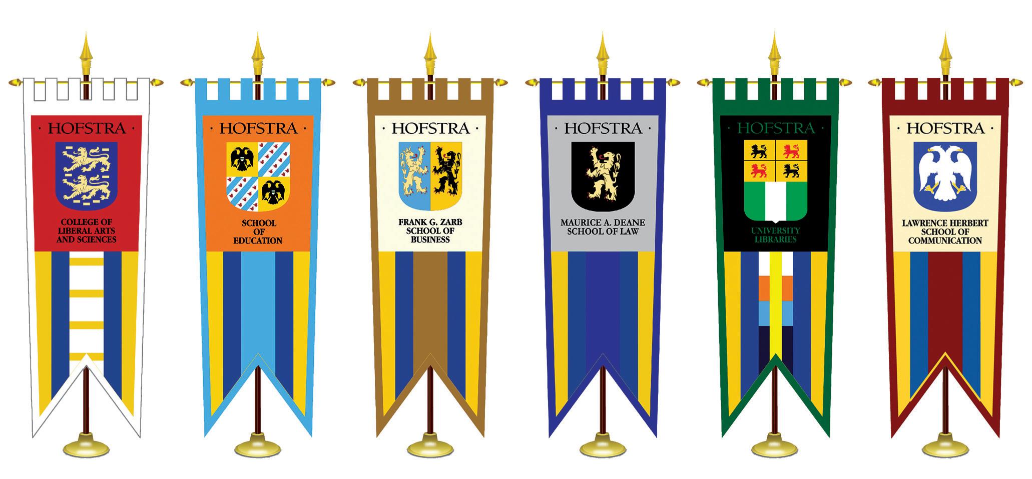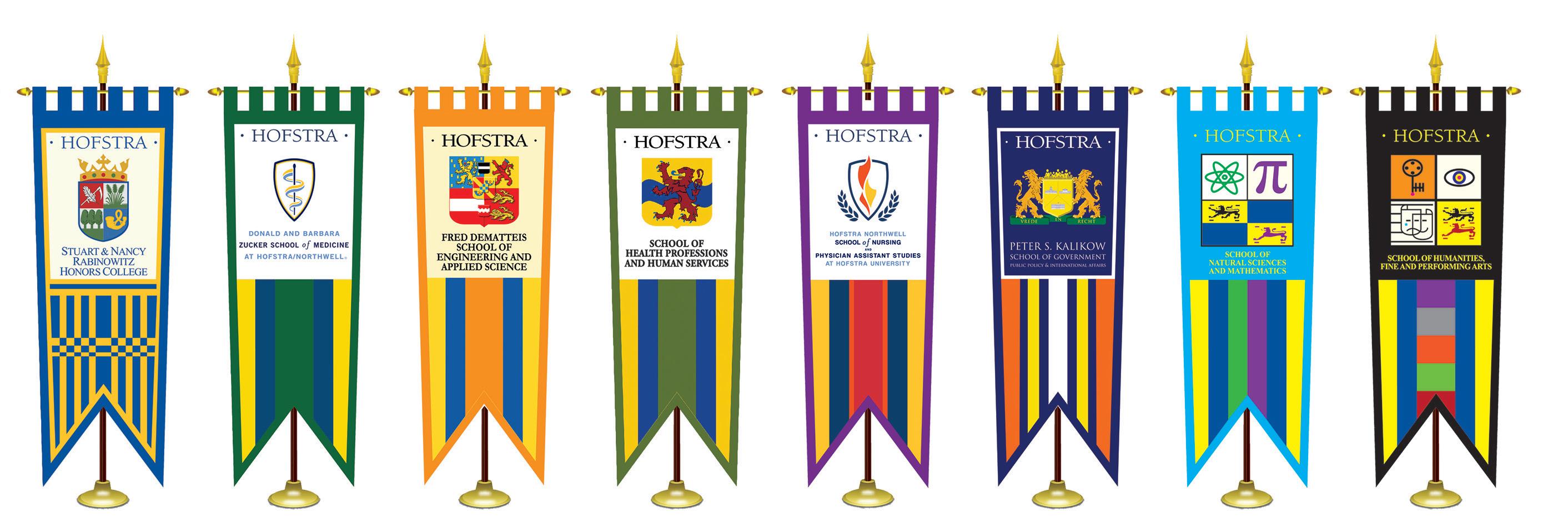 Of the 14 gonfalons, three of the fishtail ensigns plus the Hofstra seal were first presented in University ceremonies during the dedication of the Hofstra Library in 1967. The gonfalon for the Maurice A. Deane School of Law was added in 1970, followed by the Hofstra University Libraries gonfalon in 1993, The Lawrence Herbert School of Communication gonfalon in 1996, the Stuart and Nancy Rabinowitz Honors College gonfalon in 2001, the Donald and Barbara Zucker School of Medicine at Hofstra/Northwell gonfalon in 2009, and the Fred DeMatteis School of Engineering and Applied Science and the School of Health Sciences gonfalons, both dedicated in 2013. The gonfalons of the Hofstra Northwell School of Nursing and Physician Assistant Studies; Peter S. Kalikow School of Government, Public Policy and International Affairs; School of Natural Sciences and Mathematics; and School of Humanities, Fine and Performing Arts were dedicated in 2015.