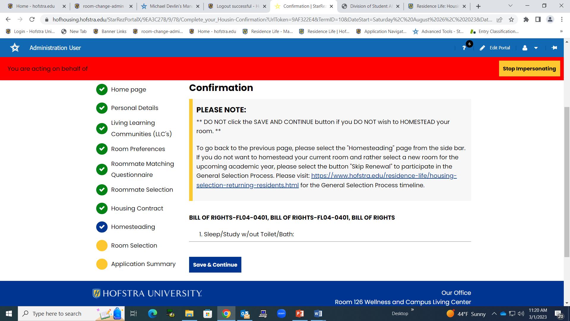 you click on the “Save and Continue” button, be sure you confirm the building, floor and room number as this will be your housing assignment for the next academic year. Once confirmed, click on the “Save and Continue” button. You have now successfully HOMESTEAD your room!
