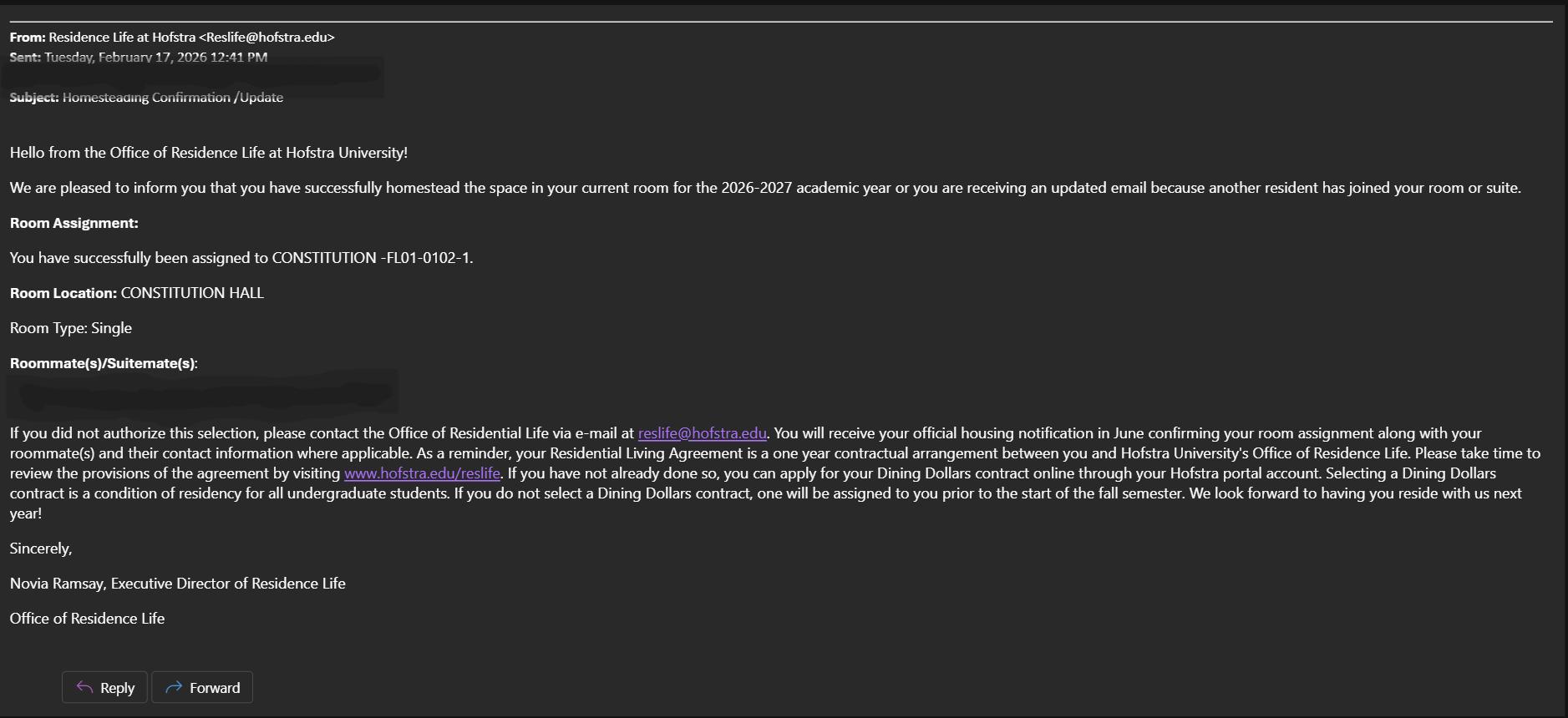 Students will receive an email to their Hofstra Pride account confirming they Homestead their