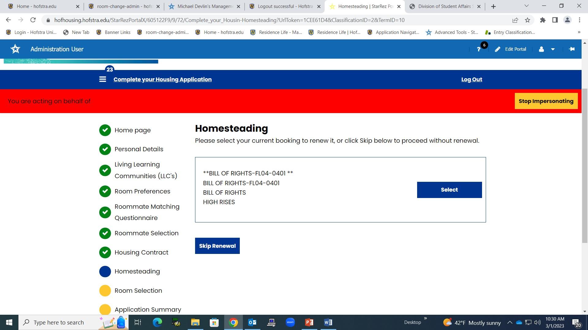 If your room is available to Homestead, you will see your current room assignment wit the option to either “Select” your room or “Skip Renewal”