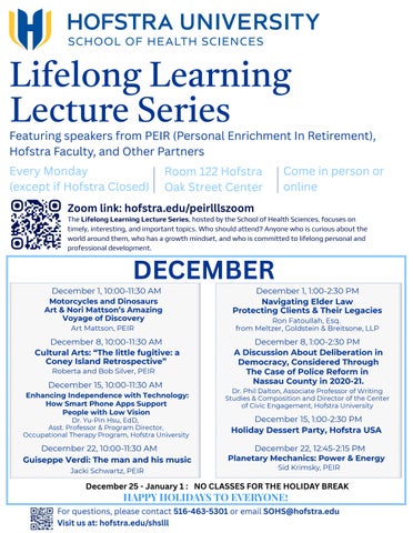 Featuring speakers from PEIR (Personal Enrichment In Retirement), Hofstra Faculty, and Other Partners