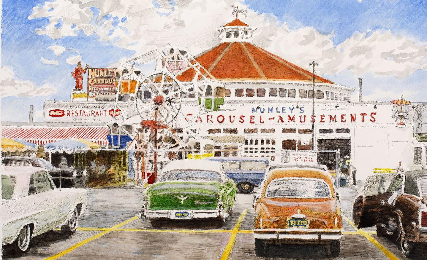 A watercolor painting by Michael White depicting Nunley’s Carousel in around 1970, which opened in Baldwin in 1940 and became a cherished destination for South Shore residents for over five decades.