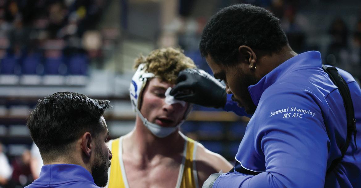 Meet days are even longer. As the trainer for wrestling, Stampley has to manage weigh-ins and skin checks, while also working before, during and after the dual.