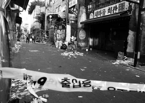 O distrito de Itaewon, um labirinto de becos estreitos, transformouse num local com corpos alinhados no pavimento tapados com cobertores ou outras mortalhas improvisadas, massagens cardíacas realizadas na rua