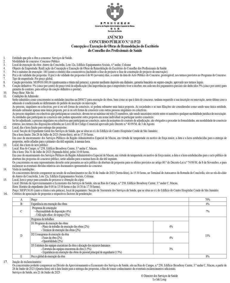 Faz-se saber que no concurso público n.o 10/P/23 para o « Fornecimento e instalação do sistema de automação laboratorial para o Edifício do Laboratório Central do Complexo de Cuidados de Saúde das Ilhas », publicado no Boletim Oficial da Região Administrativa Especial de Macau n.º 23, II Série, de 7 de Junho de 2023, foram prestados esclarecimentos, nos termos do artigo 3.º do programa do concurso público pela entidade que o realiza e que foram juntos ao respectivo processo.