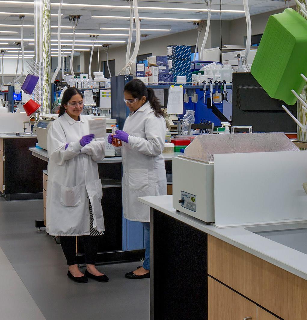Direct visual connection between the central collaboration area and the labs provides for stronger staff connections.