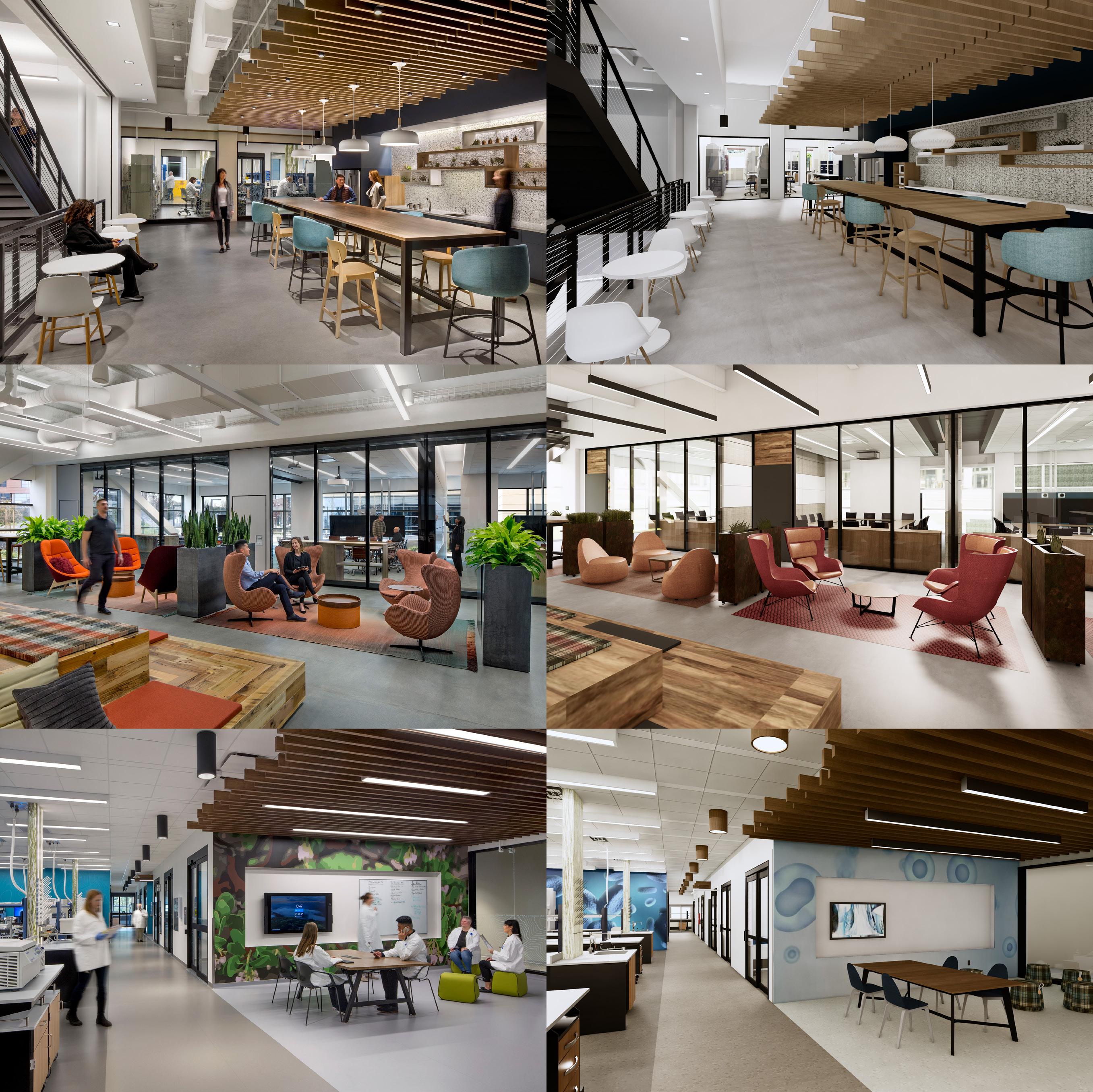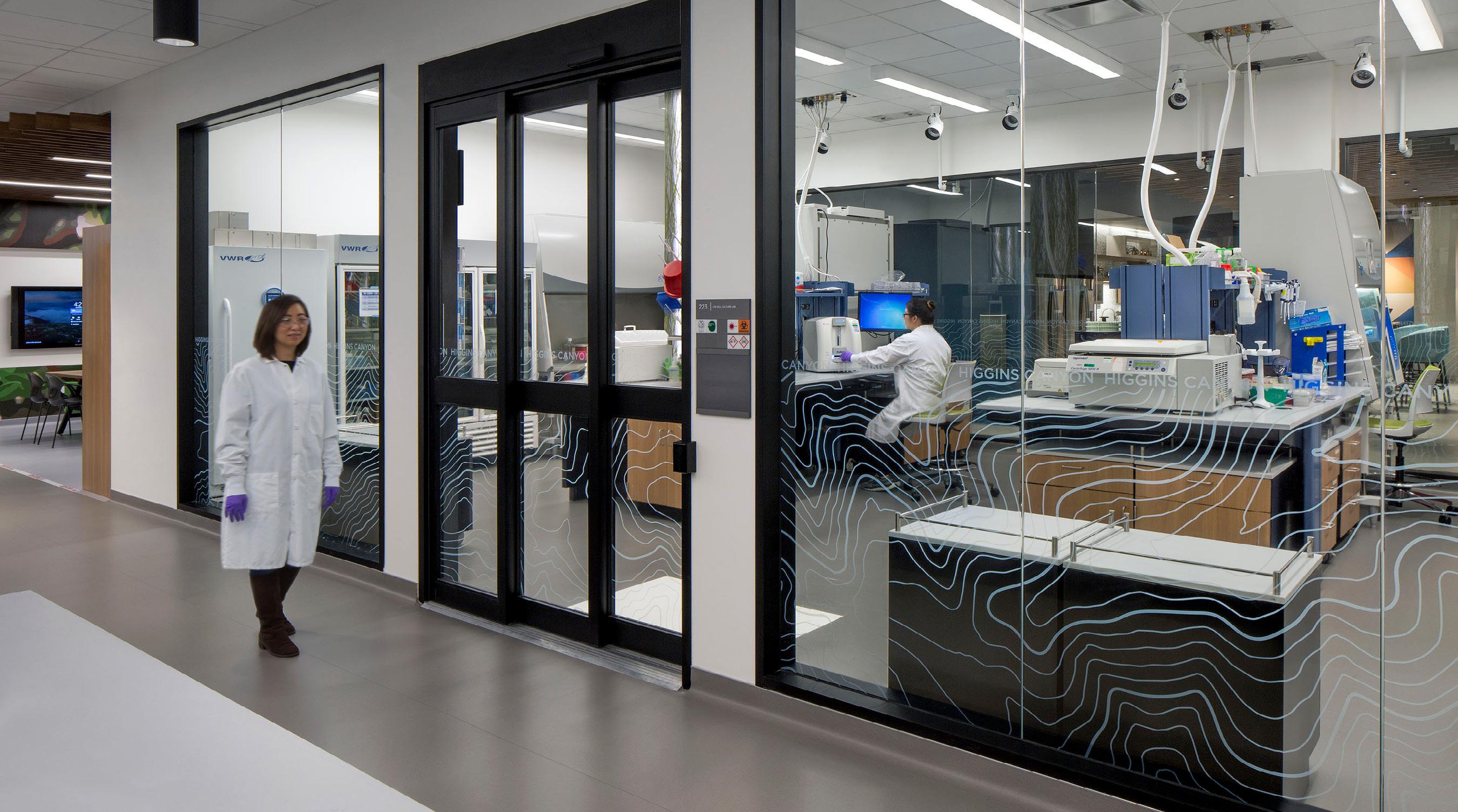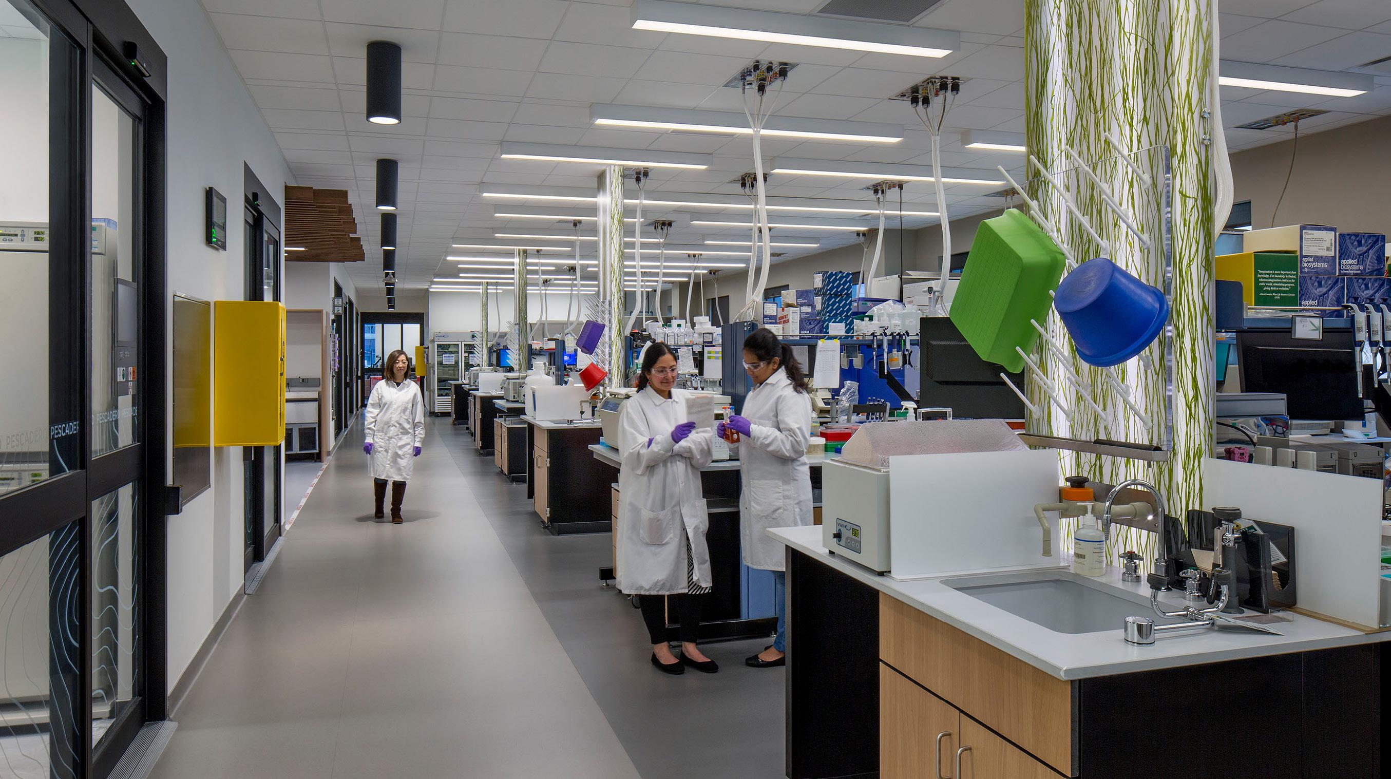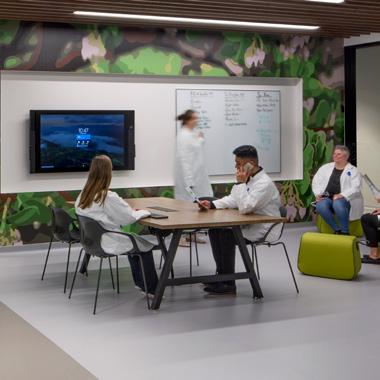 Labs are designed with standard modules and a basic “kit of parts,” but with individual identities expressed through the use of color and large-scale graphics that integrate biophilic elements as well. David Wakely