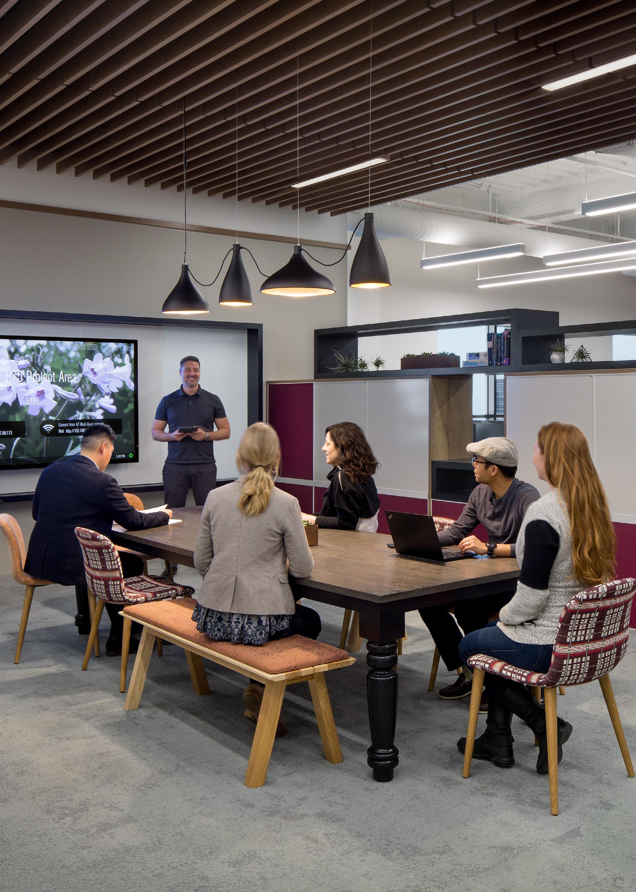 Team rooms are directly accessible from office areas, have a variety of sizes and furnishings, and are unscheduled, allowing for impromptu meetings.