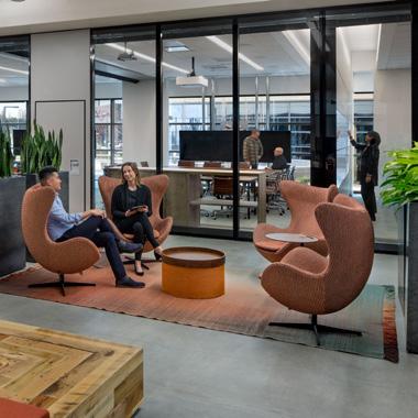 reclaimed wood, combined with bright accent materials and an eclectic mix of traditionalist and space-age furnishings make the central breakout and collaboration spaces feel like a mix of 1960s coffeehouse and tech start-up co-working space. This creates an environment that employees and visitors alike are reluctant to leave.