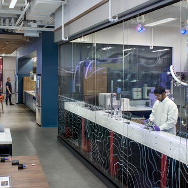 ◄ Upon entry to the building, visitors and staff alike have a direct view into working lab space, showcasing some of the company's most advanced technology.