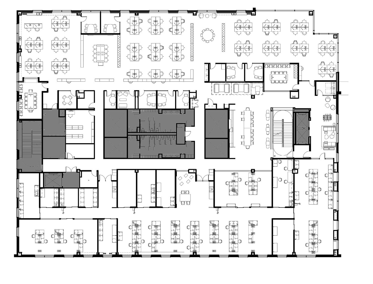 A large, central gathering space on each floor serves as a hub for all personnel. Creating a campus-like atmosphere, shared amenities were incorporated through the building to promote