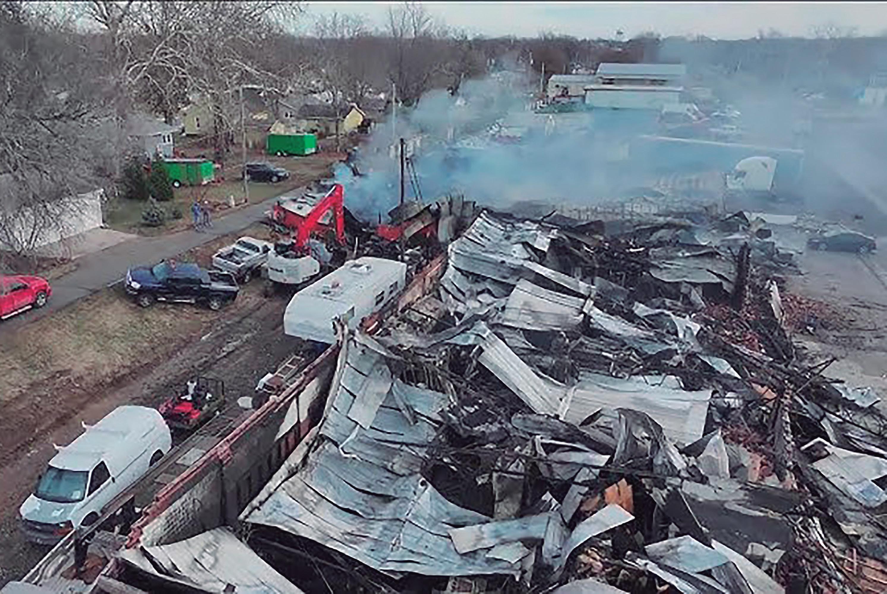 Una vista aérea muestra los daños causados por el incendio que dejó en pérdida total a El Rey Market en Perry, Iowa, a pocos días de Navidad. El negocio familiar, que sirvió a la comunidad por casi una década, ahora busca apoyo a través de una campaña en GoFundMe para iniciar su recuperación.