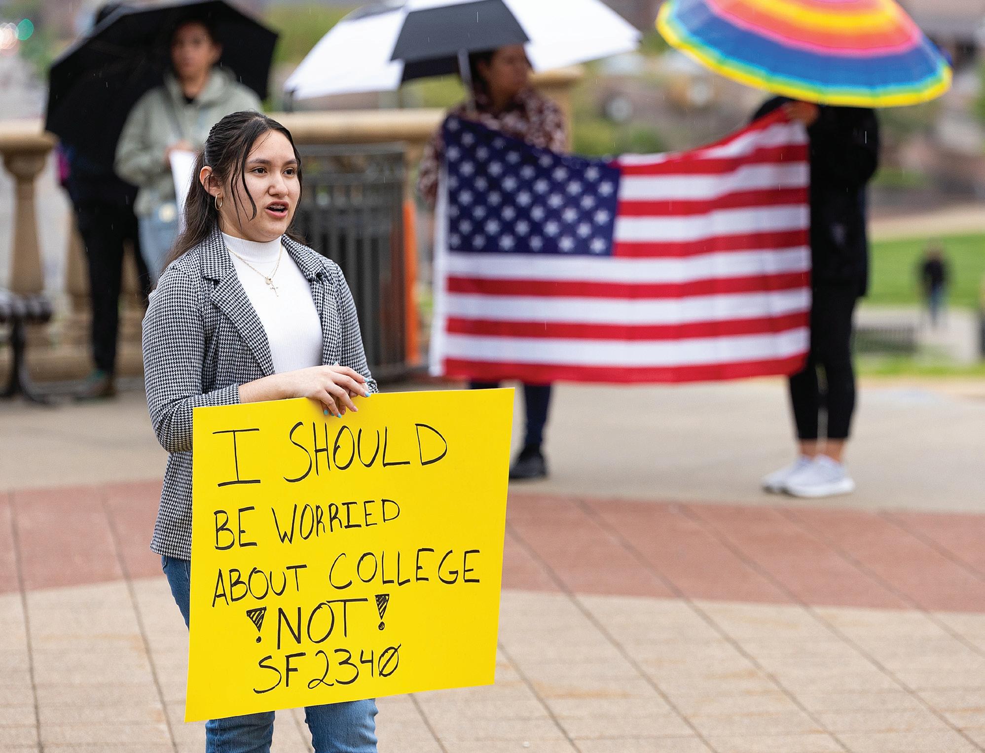 El pasado miércoles, en un mitin celebrado en Des Moines, la estudiante del instituto Hoover Alison De Luna estaba acurrucada bajo un toldo con un cartel que decía: “Debería preocuparme por la universidad, no por la SF 2340”. Otras familias a su alrededor sostenían banderas estadounidenses y coloridos carteles con la frase “por la dignidad humana” en rojo brillante.