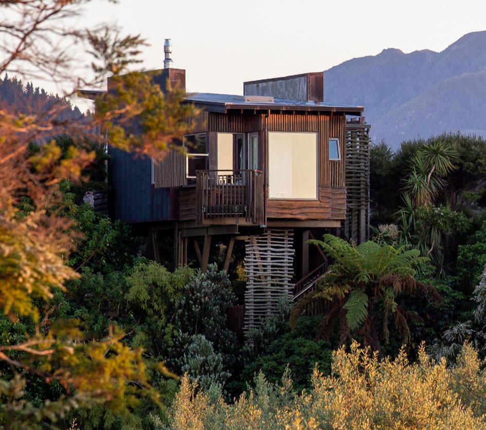 The five Tree Houses are unique, nested 10m or more above the ground in a canopy of native kanuka trees and designed to complement the natural environment. The large windows bring the tree canopy inside and afford impressive views of the mountains and ocean. Lodge suites all offer large soaking tubs, king-size beds and balconies that overlook deer paddocks towards the snow-capped mountains.