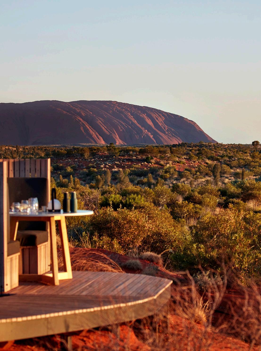 Sixteen tented pavilions have been carefully designed to offer both a luxurious sanctuary and a profound sense of place. Guests will enjoy unparalleled views of Uluru’s changing lights from inside and out; a comfortable lounge with custom furnishings and floor-to-ceiling windows invites guests to observe the sights of the outback. The private balcony with occasional furniture and outdoor fireplace is a perfect place to relax beneath a blanket of stars.