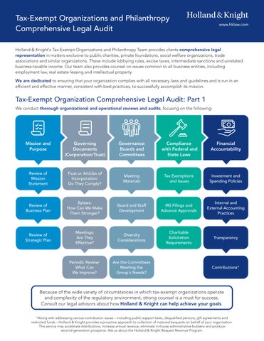 Founded in 1889, Holland & Knight is a global law firm with approximately 2,200 lawyers and other professionals in 35 offices worldwide. The Firm's lawyers and advisors provide representation in litigation, corporate and finance, real estate, healthcare and governmental matters. Interdisciplinary practice groups and industry-based teams provide clients with efficient access to attorneys throughout the Firm.