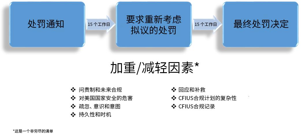 准则为处罚流程提供了在 CFR 31 章第 800.901 节中所述的路线图。首先,CFIUS 发出处罚通知,包括对将要 处罚的行为和将要处以罚款的数额的书面解释。该通知将说明断定该行为构成违规行为的法律依据,并可能列出 委员会考虑的任何加重和减轻因素。其次,收件人可以(但不是必须)在 15 个工作日内提交复议申请,包括任 何辩护、理由、减轻处罚因素或解释(如果有正当理由,可以通过书面协议延长期限)。最后,CFIUS 将在收 到申请后的 15 个工作日内(可通过书面协议延长期限)在发布最终处罚决定之前考虑收到的任何申请。