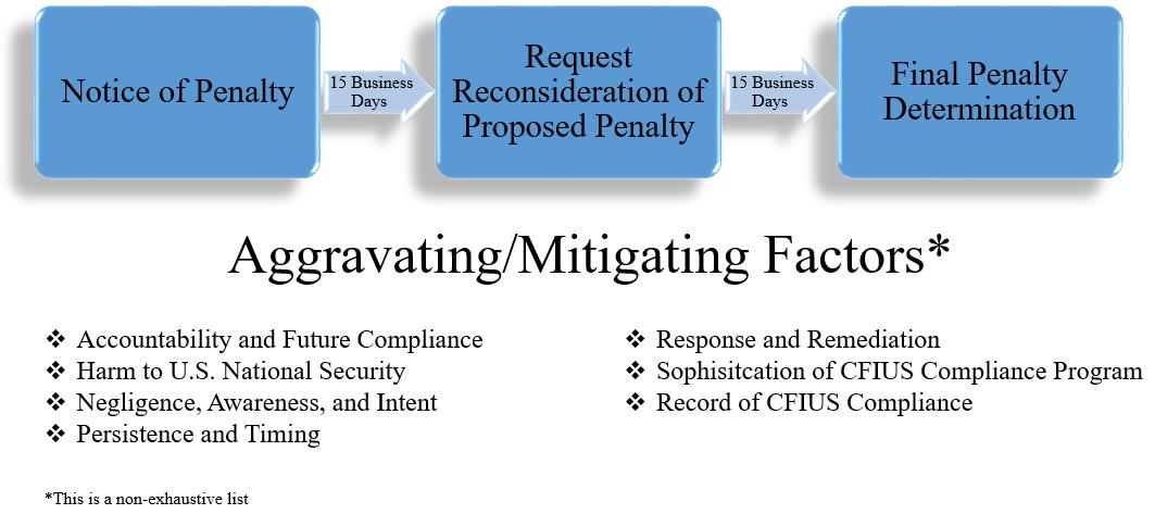 The Guidelines provide a roadmap for the penalty process as described in 31 C.F.R. Section 800.901. First, CFIUS sends a notice of penalty, including a written explanation of the conduct to be penalized and the amount of any monetary penalty to be imposed. The notice will state the legal basis for concluding that the conduct constitutes a violation and may set forth any aggravating and mitigating factors that the Committee considered. Second, the recipient may (but is not required to) submit a petition of reconsideration, within 15 business days, including any defense, justification, m itigating factors or explanation (the period may be extended by written agreement upon a showing of good cause). Finally, CFIUS will consider any petition it receives before issuing a final penalty determination within 15 business days of receipt of the petition (the period may be extended by written agreement).