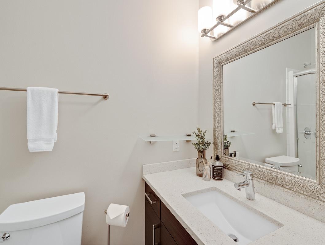 bathroom. The kitchen boasts a stainless steel appliance package with quartz counter tops. Upstairs you will find the large Primary suite with its own private deck, and ensuite. Added features in this special offering include: heat pump with A/C, in-suite laundry, and geothermal radiant in-floor heating and hot water.