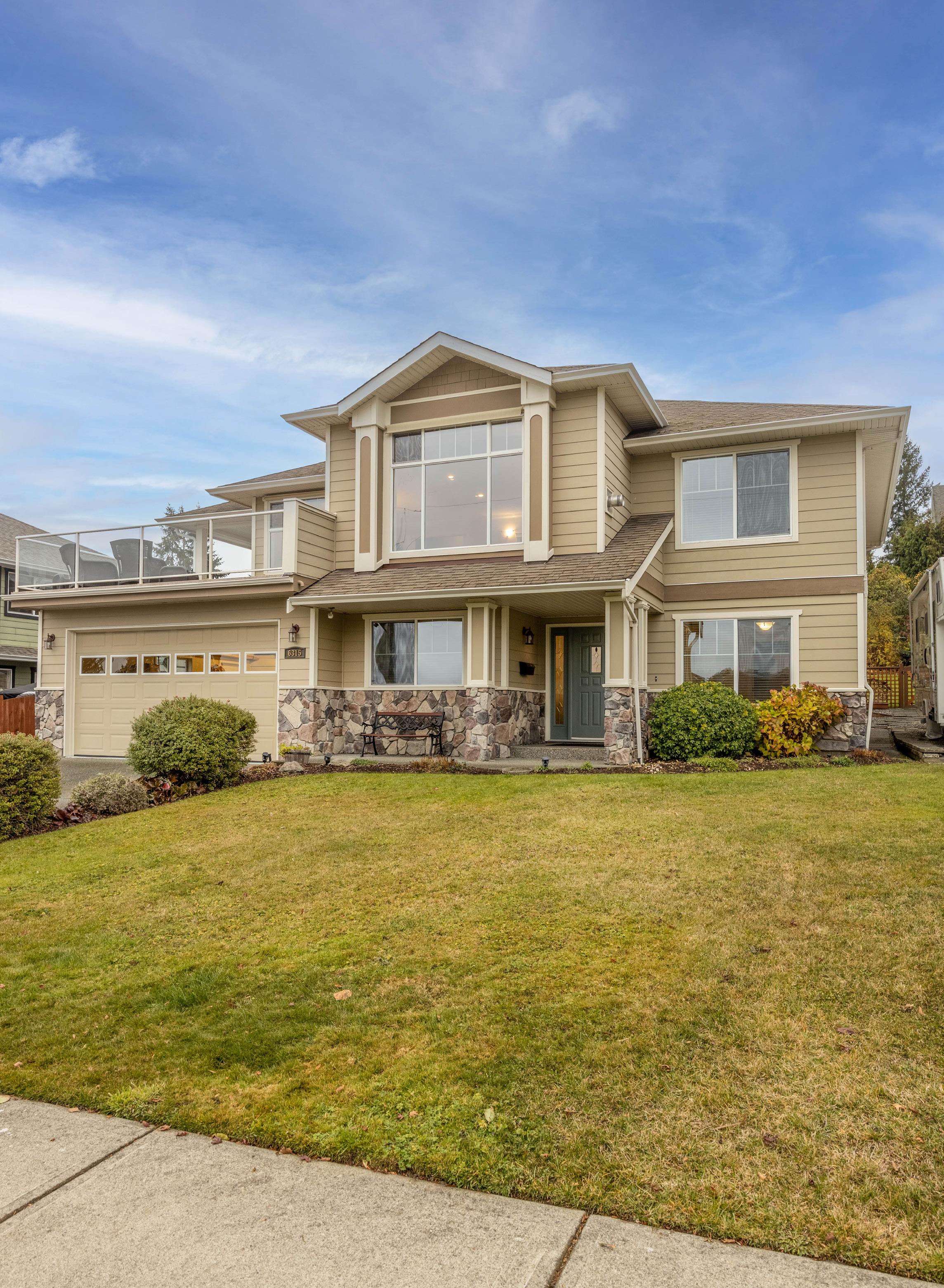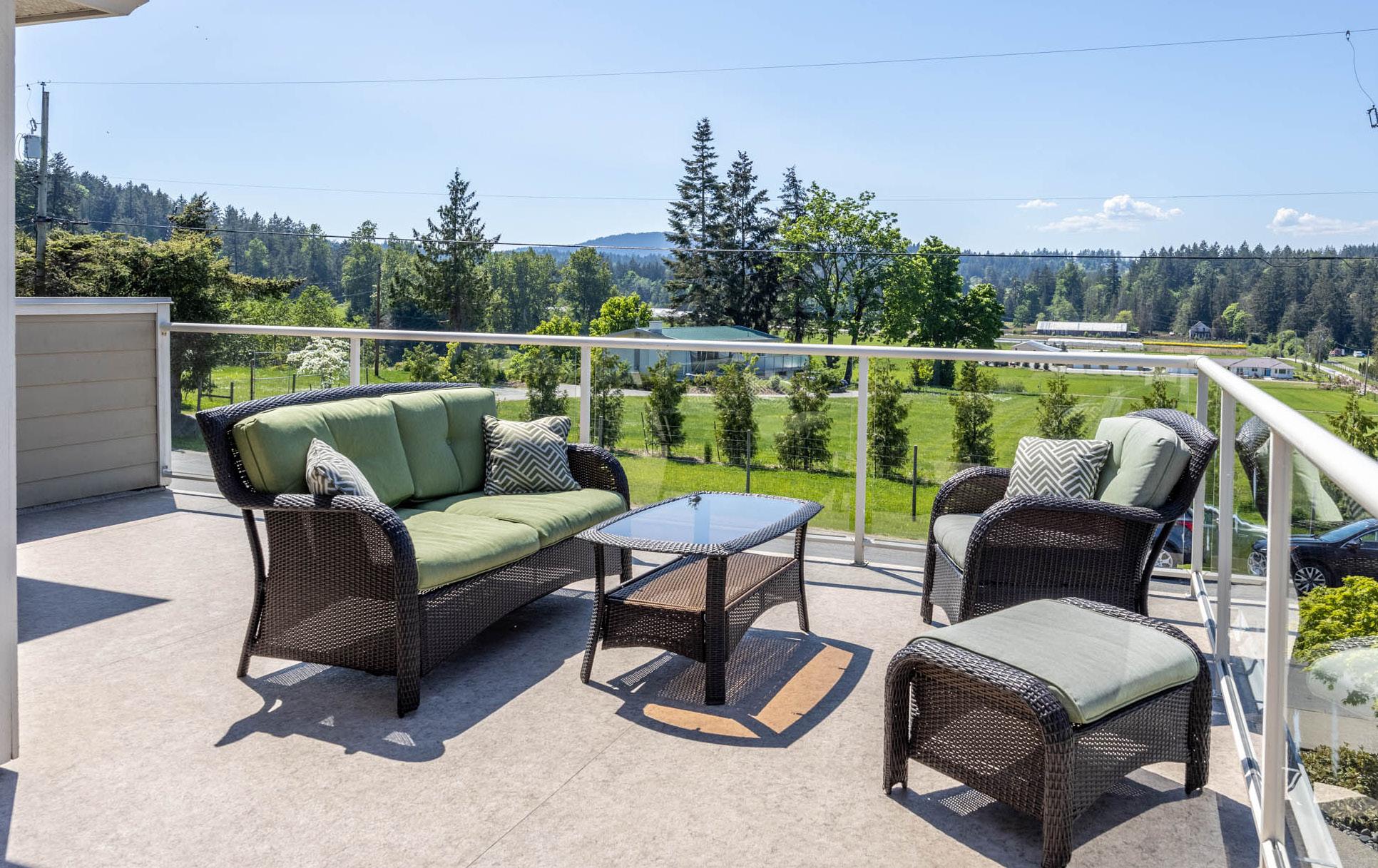 Located on the quiet, private end of the road with gorgeous valley and farmland views, this 4 bed 4 bath home which includes a LEGAL 1 bed suite is sure to please as pride of ownership is evident here. Fabulous curb appeal with stone and pillars and a beautiful backyard will entice you to step inside. You will love the design as the 3 beds and living area are all upstairs on one level and a family room and den down. Spacious living room and dining room feature oversized windows which bathe the room in natural light, gas fireplacer and engineered cherry floors. Step