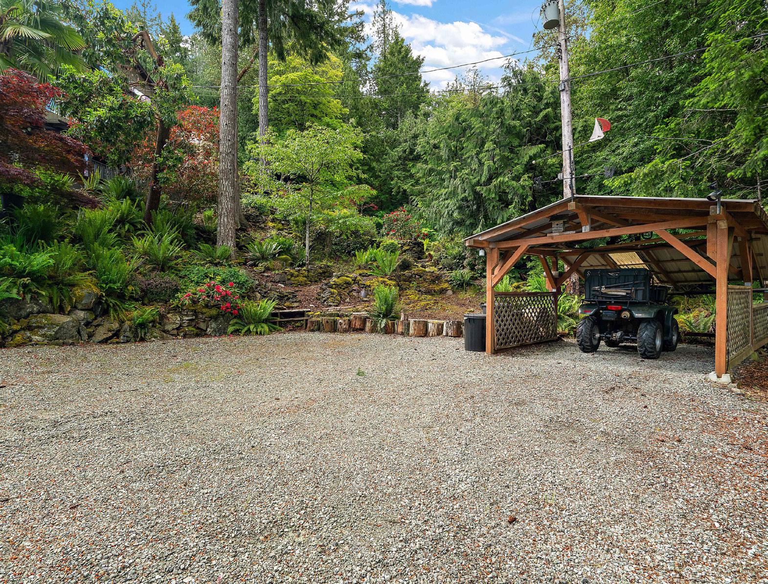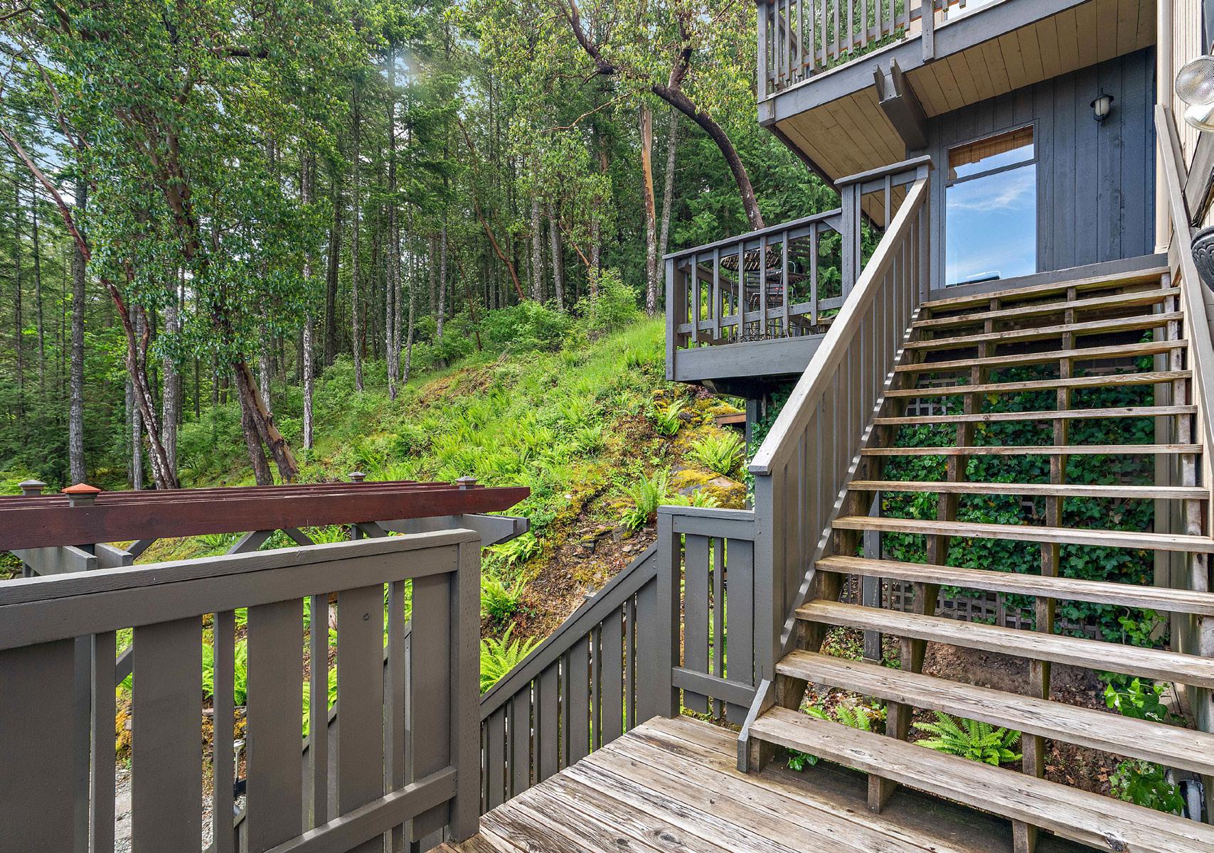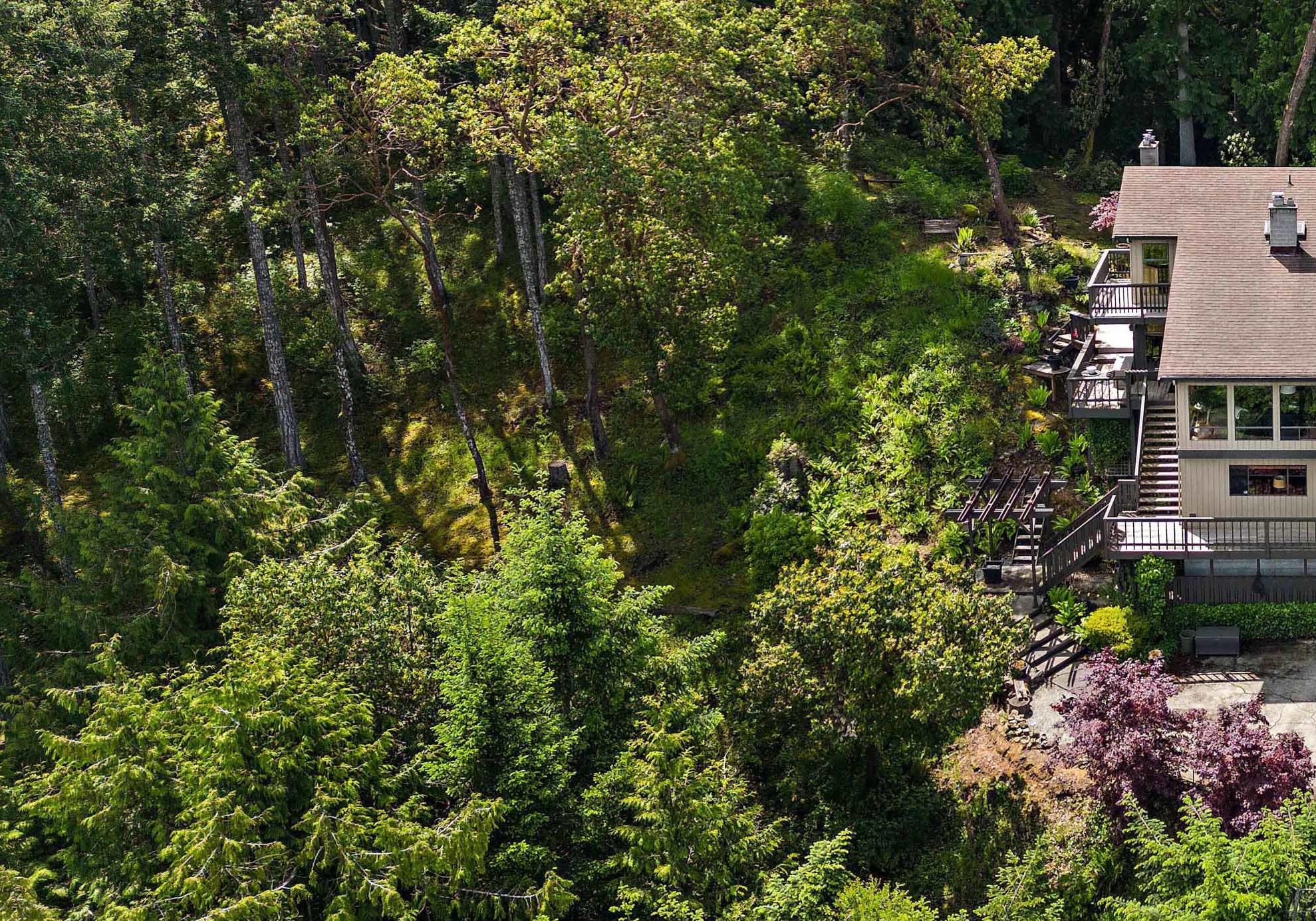 Double car garage, workshop, carport and additional parking for multiple vehicles. No grass to mow on this sloped easy care natural woodland. Situated close to Sidney, airport ferry terminal.