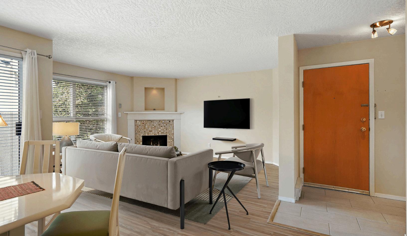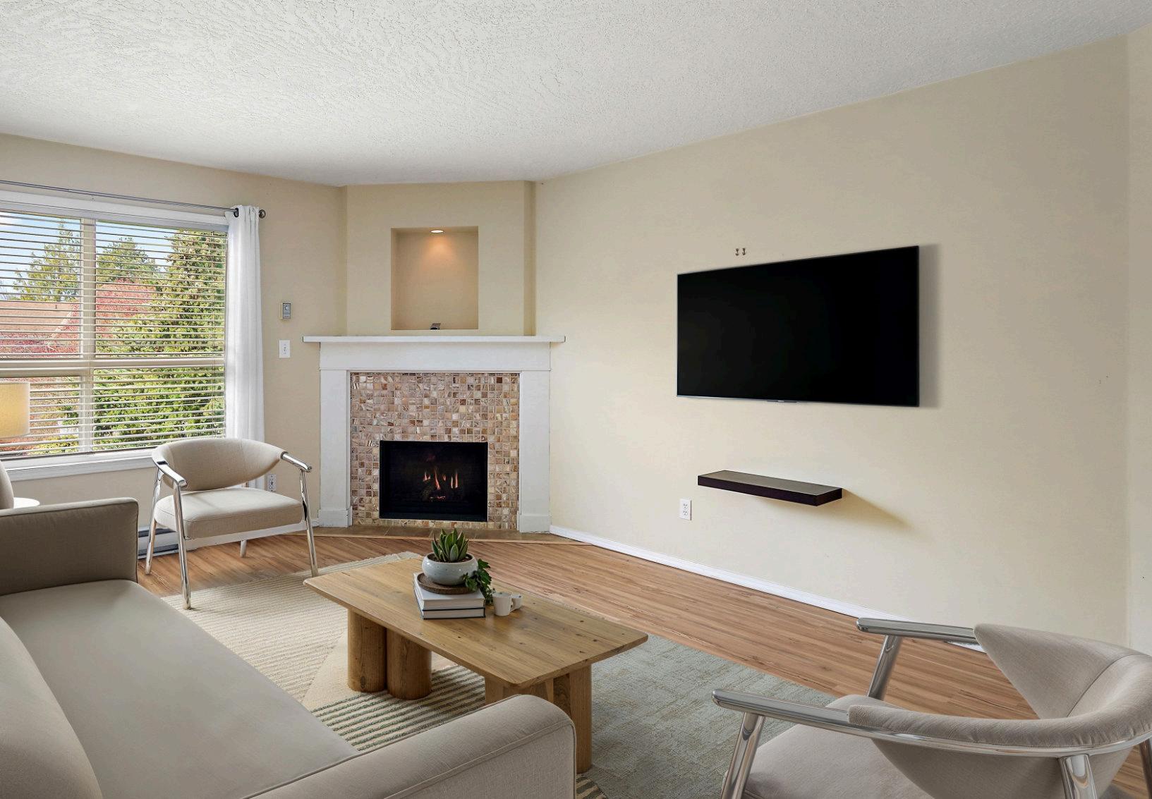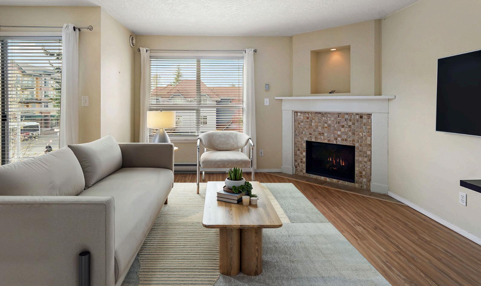 featuring a custom-finished gas fireplace that adds comfort and style. The updated bathrooms offer modern touches, while both bedrooms are generously sized and filled with natural light.